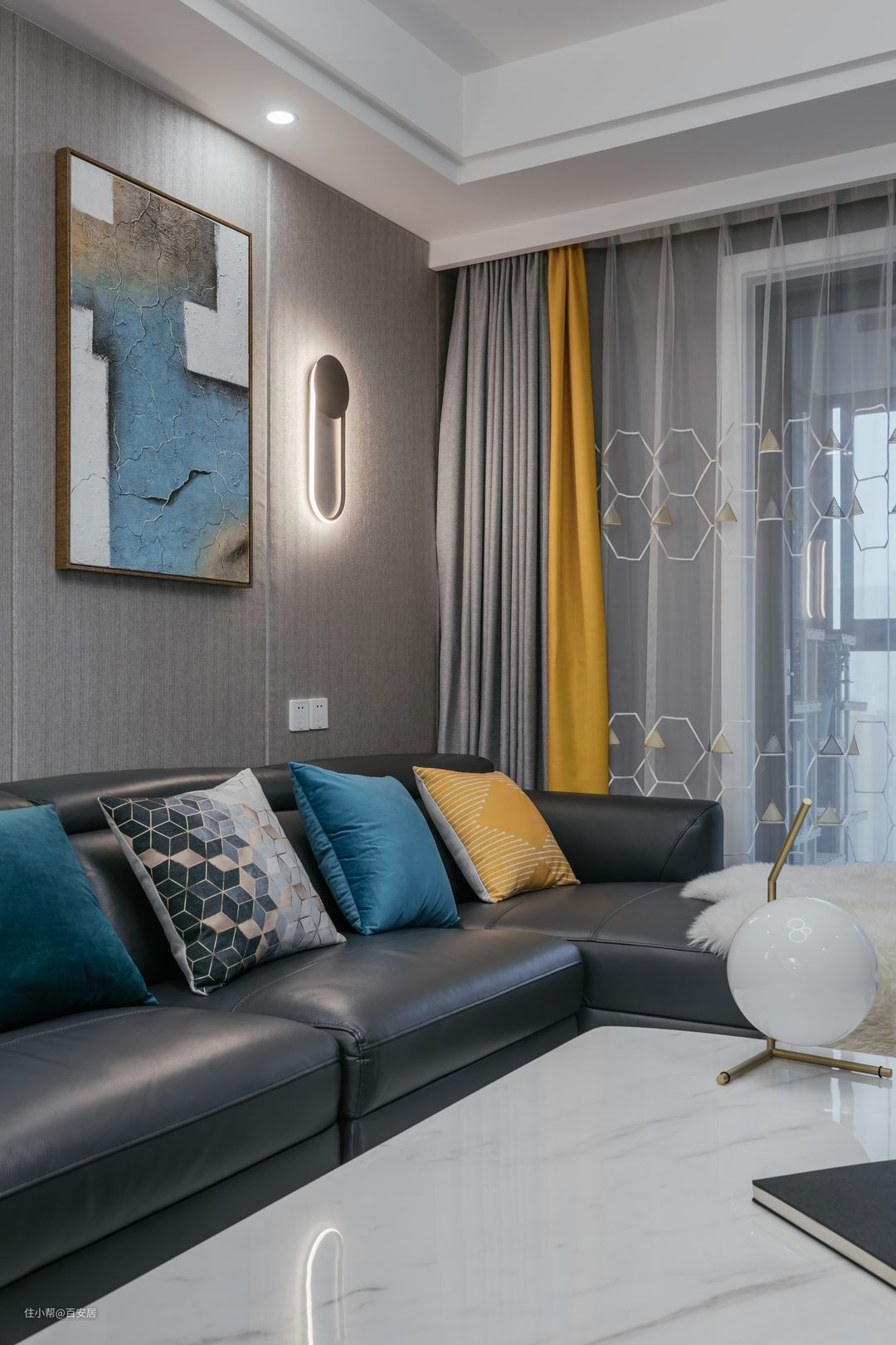蓝灰色的组合皮质软沙发,与电视背景墙相协调,搭配白色大理石材质茶几,合围出客厅的主范围。香槟灰色木饰板面打造质感高级的沙发背景墙,并用金属材质的壁灯加以点缀,更添时尚感。 黑白灰的搭配让整个客厅空间层次丰富,明黄色的单人椅、窗帘和抱枕在黑白灰构建的视觉环境中起到了点缀作用,中和了灰色大理石纹的厚重感,又仿佛是将一缕阳光带入客厅,冷与暖的交融,打造出轻奢明媚的视觉效果。