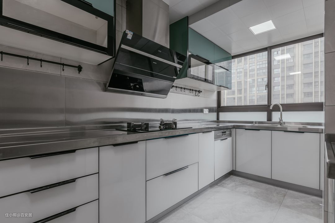 为了使封闭的空间明亮通透,特地选用透光性极好的玻璃推拉门,加上两扇窄边玻璃窗,整个空间视野开阔,宽敞明亮。 长方形的厨房,U型操作台和宽阔的活动空间并行,可以容纳更多电器设备,满足一家人烹饪和享用各种美食的需求。吊柜与橱柜按需划分,色泽低调纯净,最大化地增加了收纳空间,让厨房彻底告别凌乱。
