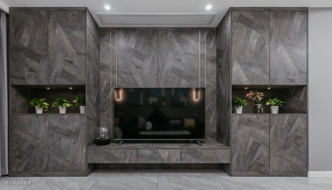 大面积的大理石纹灰色岩板打造整体电视背景墙和电视收纳柜,大理石的材质与木纹的肌理感相结合,并辅以金色线条加以点缀, 与轻描淡写中,为其增添了精致感。 落地的收纳柜既易打理又增大了客厅的收纳空间,实用性与颜值并存,整个空间氛围既沉稳又不失时尚气息。