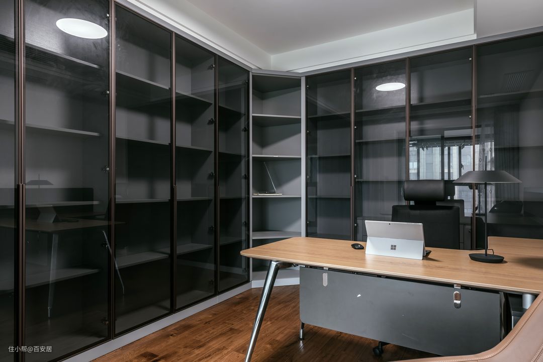 书房的设计风格则更多的体现了业主的内涵与品位。书房整体以深灰色系搭配棕色系构建视觉环境,沉稳内敛的气质赋予书房独特的氛围。 考虑到业主喜爱读书和收藏书籍的爱好,书房的两面墙都打造成了书架,书架转角处专门定制了扇形,合理利用每寸空间。原木色桌面搭配深灰色简单线条的桌脚,让整体空间极具都市感又不会显得过于沉闷。桌面天然的肌理感,营造出返璞归真之感,可以让阅读和工作更加放松、专注。