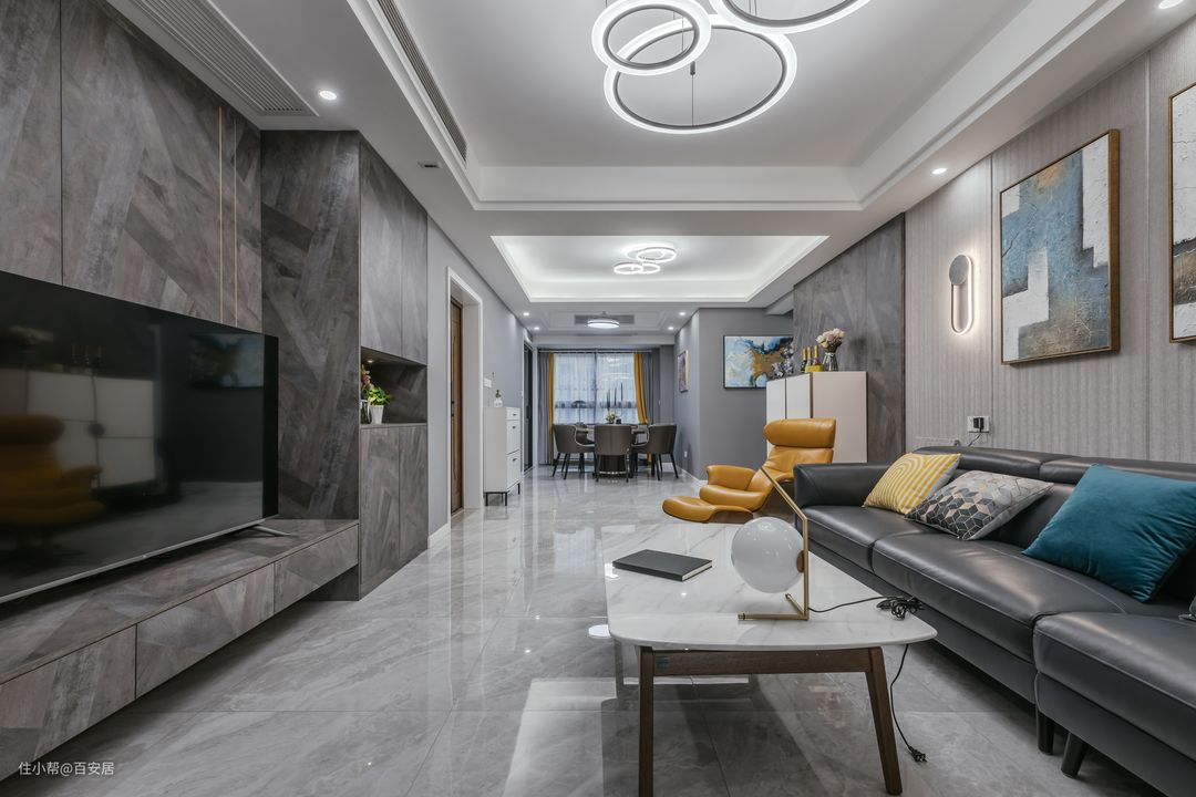 客厅以深浅不一的灰色和白色搭建视觉环境,采用大面积灰色大理石瓷砖搭配亮白的天花,奠定了空间的整体基调,不同材质与不同层次的灰色和谐统一并相呼应,打造简单又不失质感的空间。 通铺浅灰色的大理石纹亮面地砖,与高级灰色墙面和亮白的天花相协,空间通透明亮。挑高的方形吊顶缀饰的隐藏灯带和分散在各处的点状射灯,使空间光线更加均匀,客厅在视觉上更显宽敞舒适。