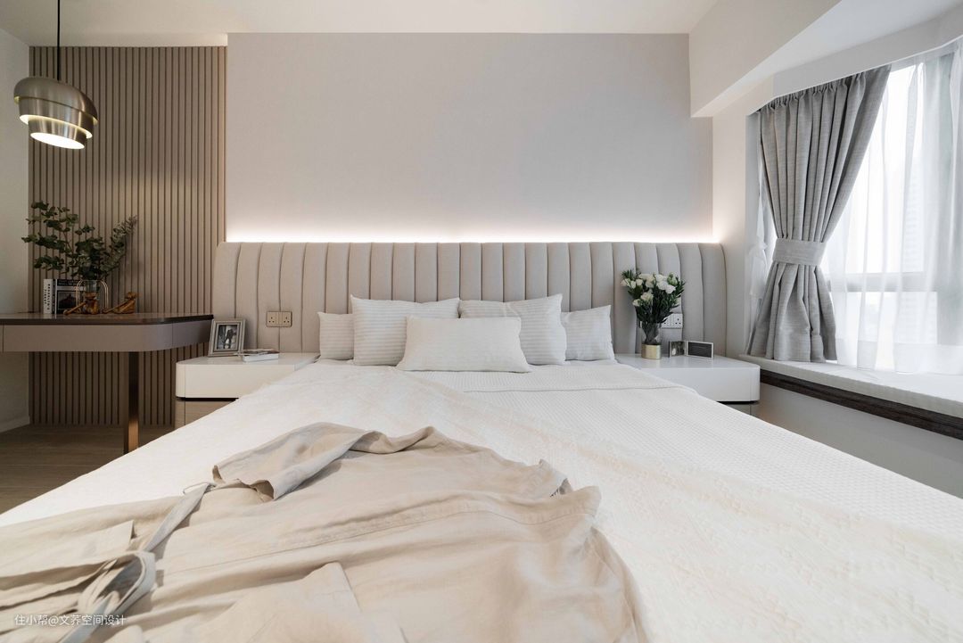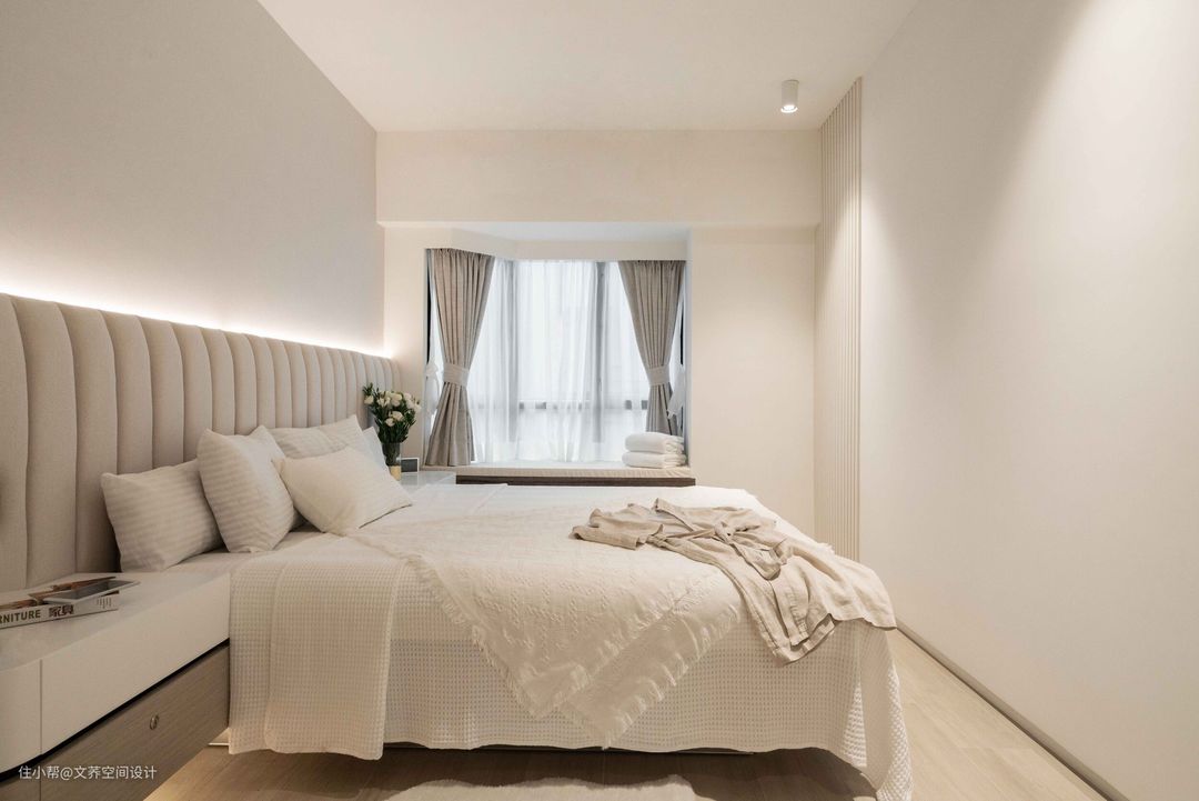右侧的床头紧邻飘窗,白色+浅咖的颜色搭配,高级又富有艺术感。 #卧室设计 #嵌入式灯带 #飘窗设计