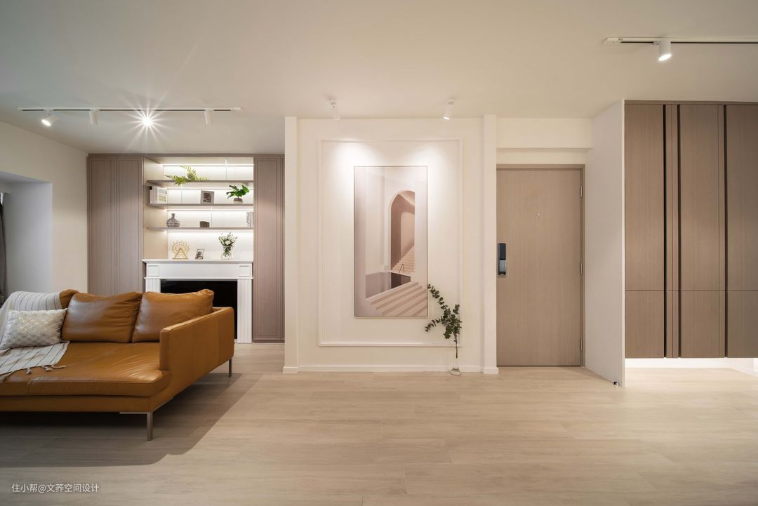 从这个角度看,可以看到客厅和玄关区域,视觉上给人的感觉还是比较宽敞的。再加上整个公共空间采用的无主灯设计的理念,显得十分大气简洁。通过一旁的展示画作为衬托,不经意间呈现出清新淡雅的感觉来。 #玄关 #客厅 #无主灯设计 #装饰画