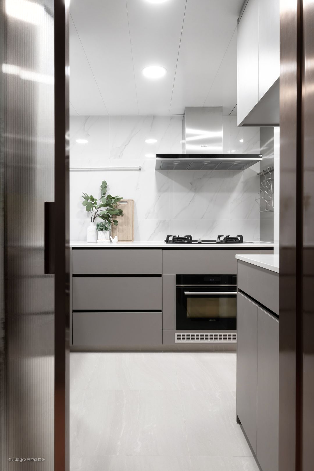 原本厨房的窗户比较小,所以并没有设计大面积的吊柜。采用的L型台面+嵌入式设计,让厨房的操作性和收纳性都更强,而长虹玻璃门的设计也让厨房区域的通透感也更强。 #厨房 #长虹玻璃 #厨房设计