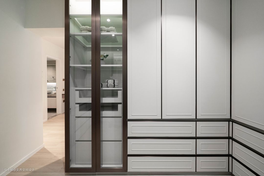 衣柜的柜体以奶白色搭配黑色框边,整墙的衣柜让这个家的收纳空间倍增,黑色线条设计也可以缓解整墙柜子的拥挤感。 #衣柜设计 #衣帽间 #衣柜 #书房