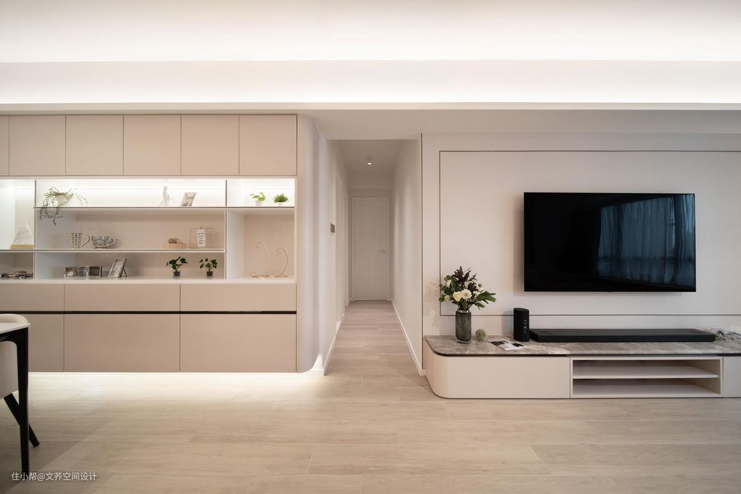 客厅的墙面利用大面积的白色作为背景色,地面通铺了实木地板,木色的温润感很好的中和了大白墙带来的单调。客厅在白色与木色之间,还原生活最本真的状态。 #客厅 #实木地板 #无主灯设计 #软装搭配