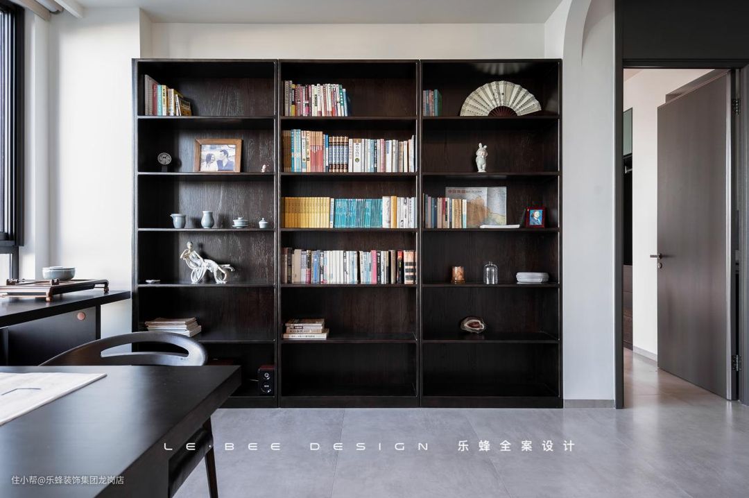 开放式设计,书房拥有极大包容性。因为平日业主二人居住,更注重书房使用的宽松舒适体验,没有设计隔断,书房的位置,出入客厅和卧室,动线都无比流畅。 在外也能直面书架,何尝不是一处新景。