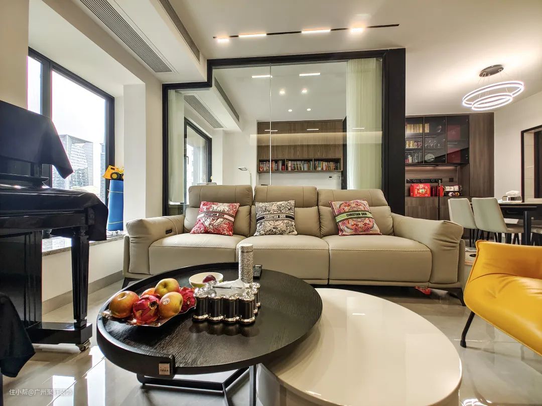 米白色的皮具沙发搭配黑白组合的轻奢岩板茶几,不同材质的巧妙融合,提升了空间的整体质感。