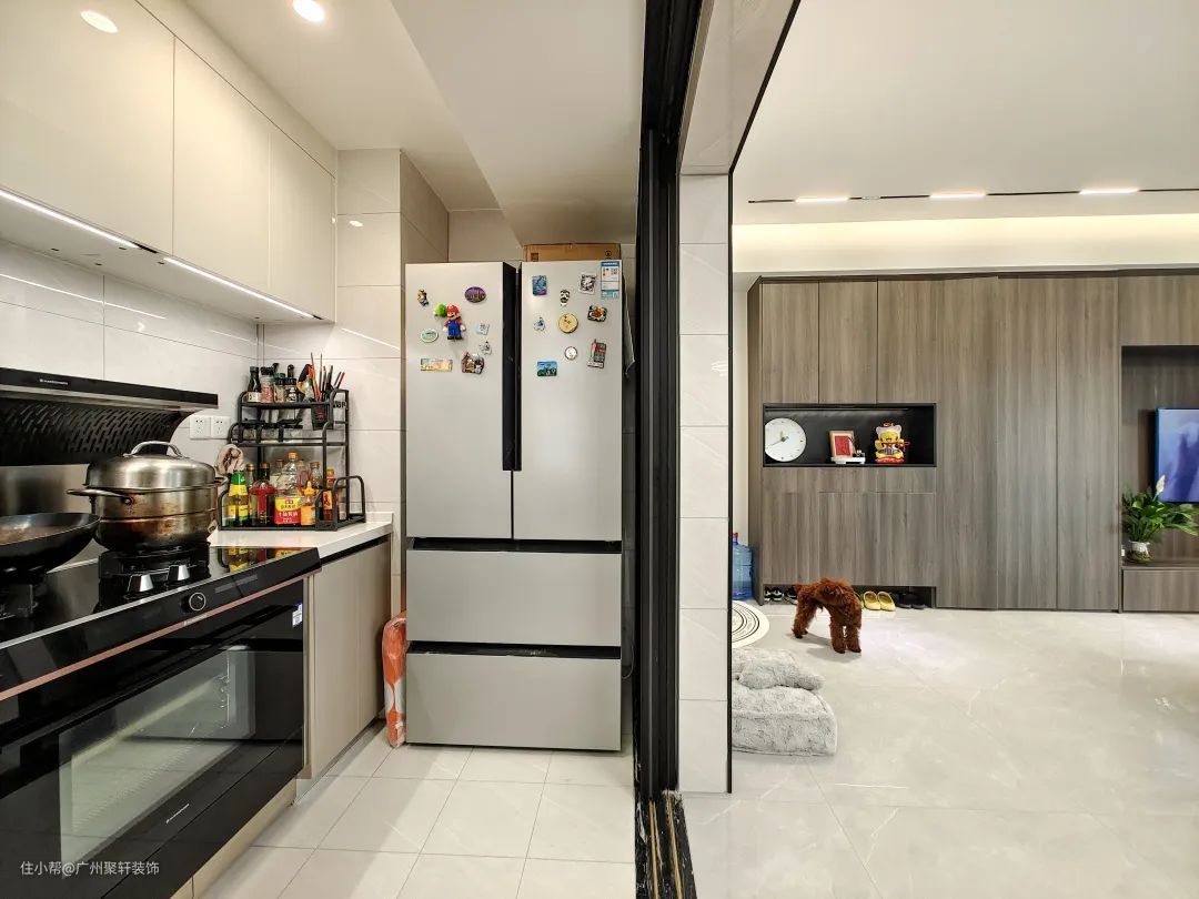 原格局的厨房与阳台打通,使上下双层的橱柜长达4.5m左右,满足了居者对下厨的所有理想状态,以及收藏颜值高的厨具需求。 使用集成灶,厨电隐蔽于橱柜之中,配合吊柜+挂杆的设置,充分展现空间美学。浅灰和奶白的结合,清新又亮堂。