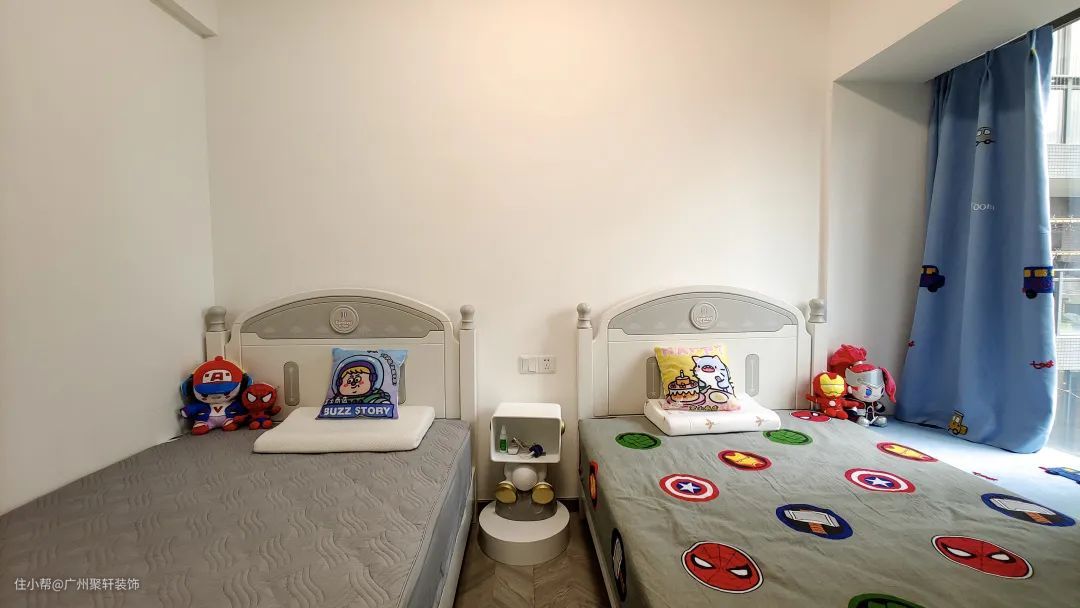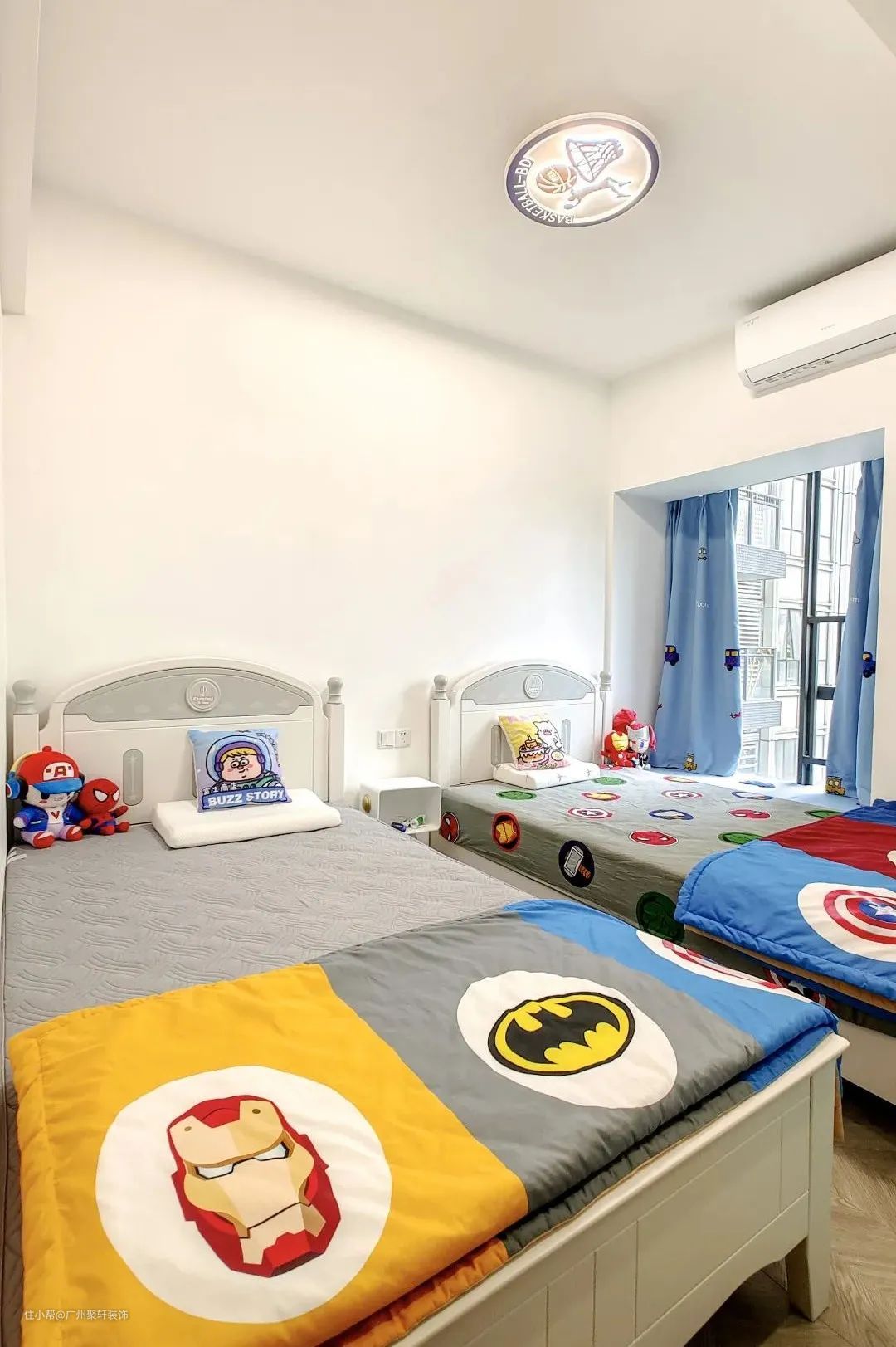 软装以灰色和蓝色为主,有兄弟俩喜欢的蜘蛛侠等超人英雄、宇航员床头柜夜灯摆件......有趣有态度。