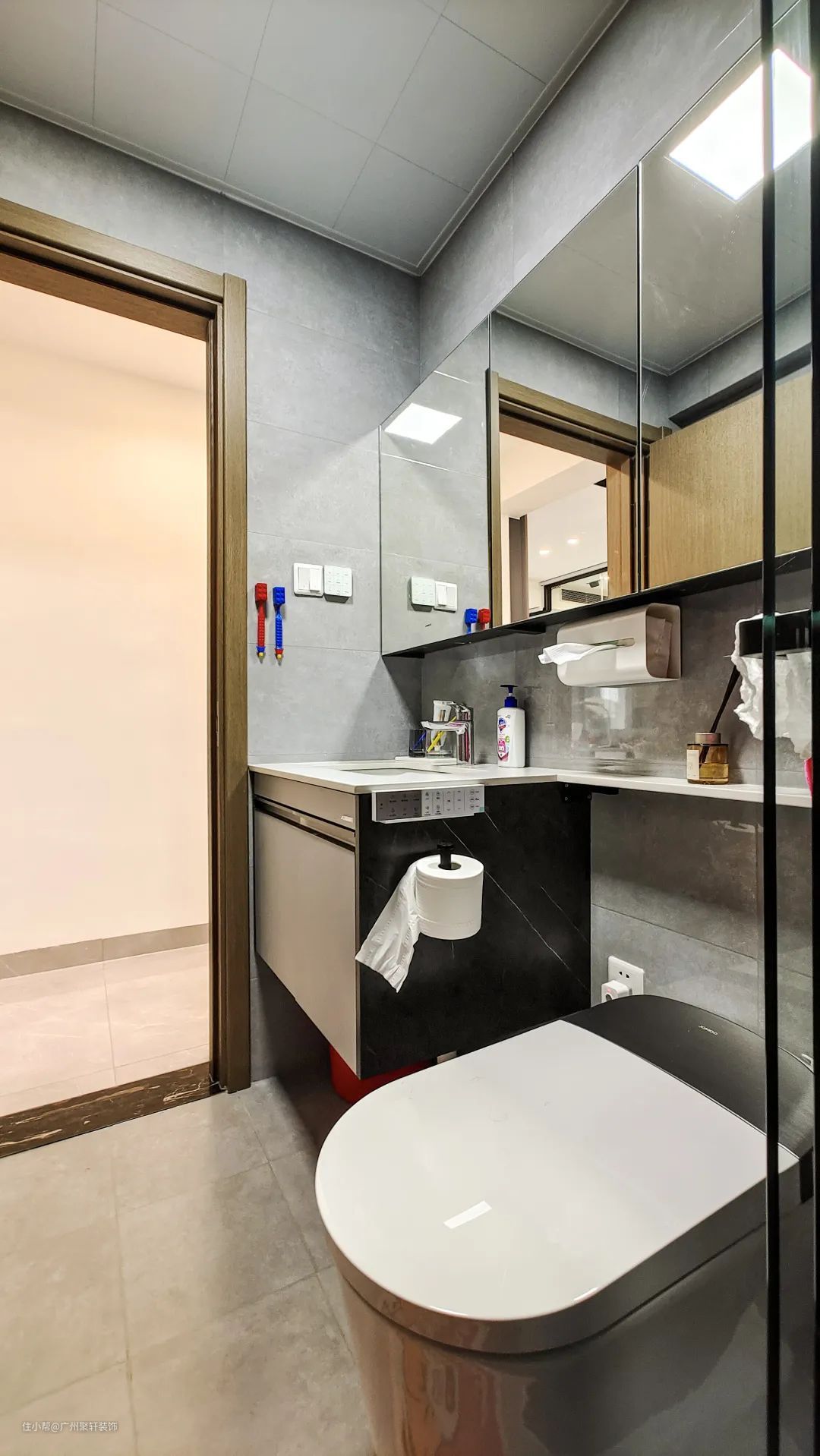 卫生间用浅灰调和白色搭配,干湿分离区域划分明显、镜柜延长「放大」空间,满足日常使用。 地面选择了防滑砖,从设计细节上呈现品质。