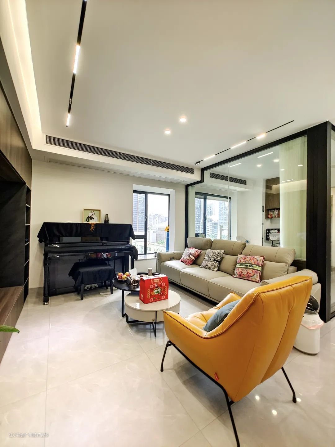 沙发背靠的玻璃窗里就是一个小的书房&音乐房,半开放式的设计保证了空间的通透性,也有一定的隔音效果。