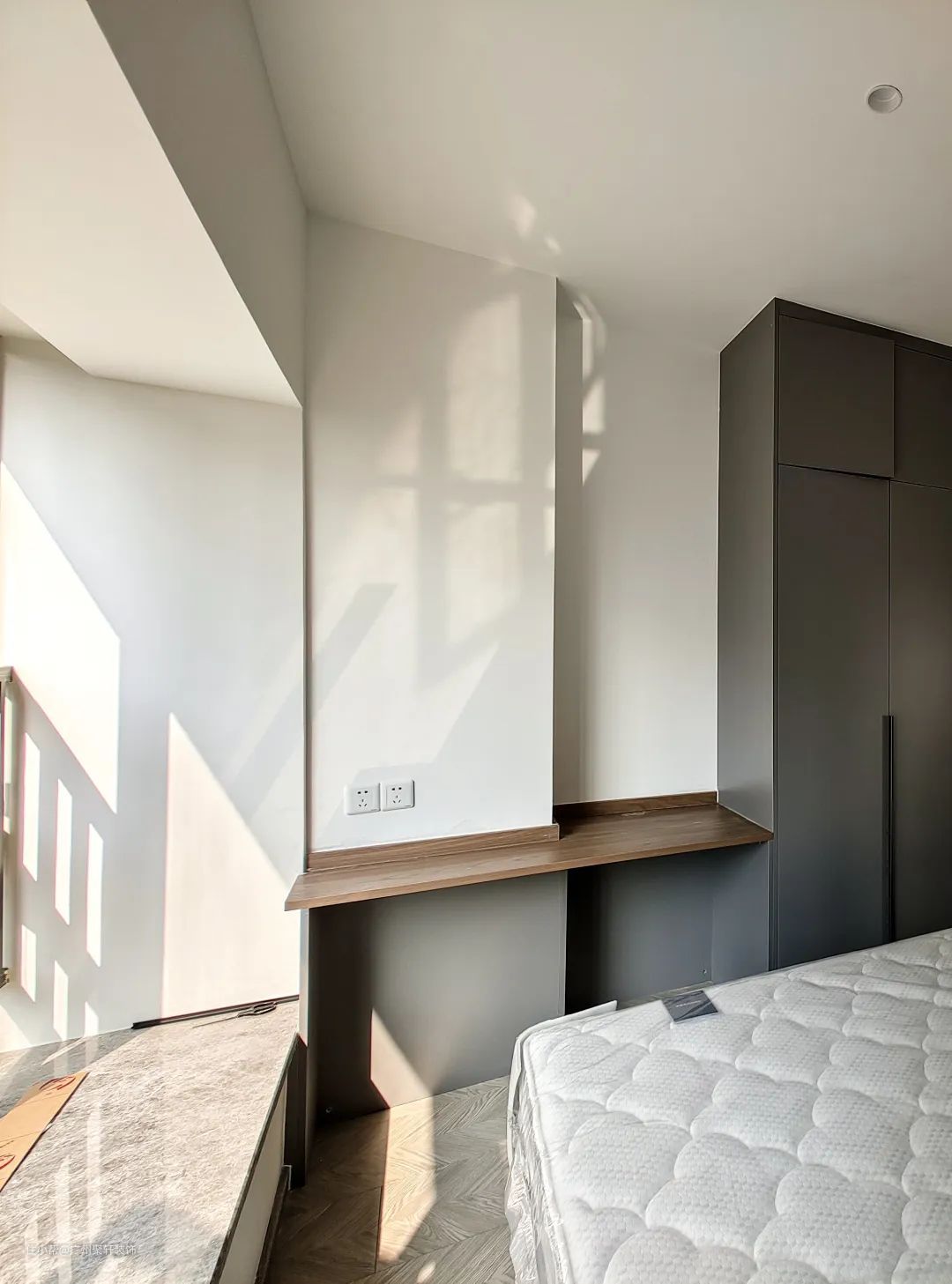 主卧大面积留白辅助高级灰,利用柔和的木地板提升空间的温馨感。放低飘窗台,带来更大的采光与休闲。