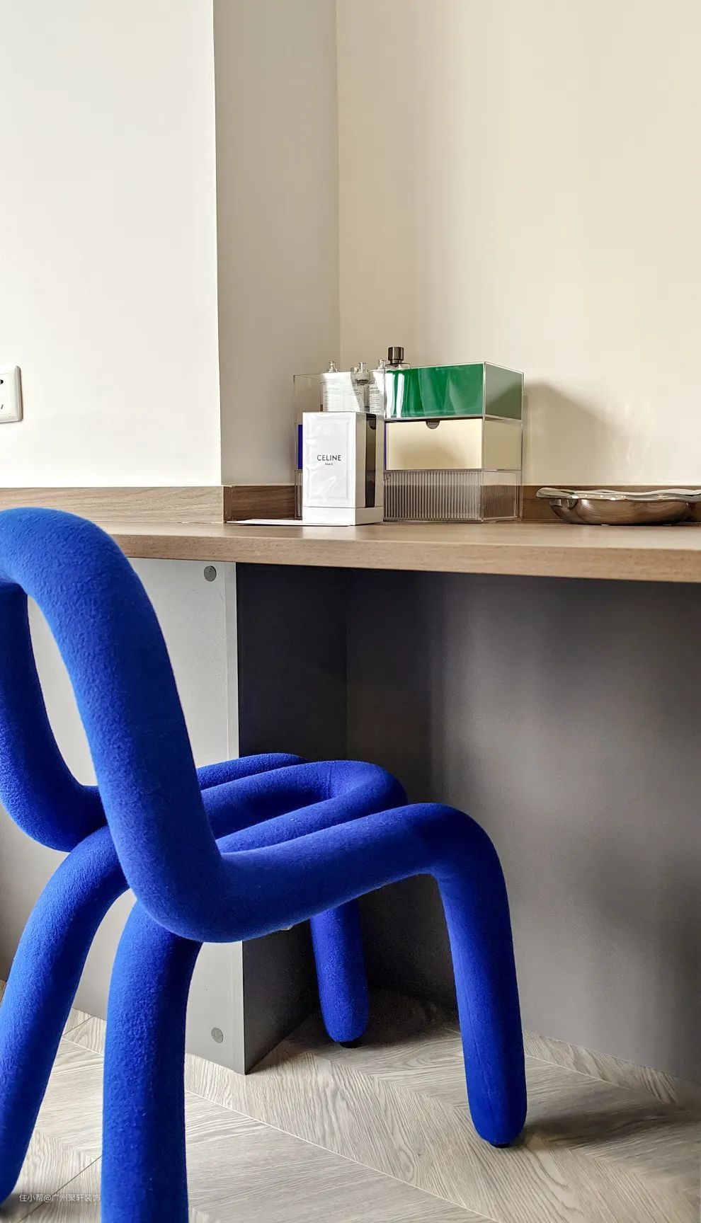床尾一排定制衣柜+梳妆台一体,再搭配Bold Chair -Mustache温柔与浪漫的克莱因蓝,充分体现了现代年轻人对生活的追求和品位。