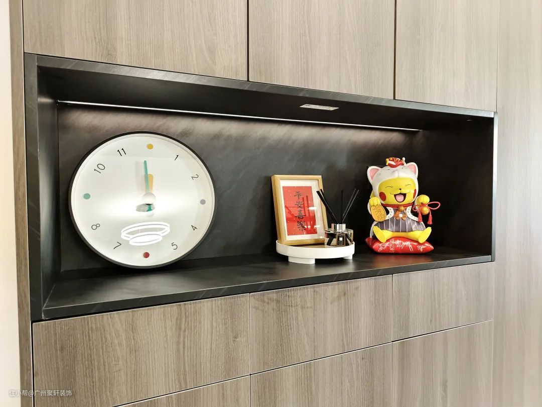 整个空间都做了简单的吊顶以及无主灯设计,运用辅助灯的结合给空间和局部背景增加了些层次,也使空间更富设计美感。