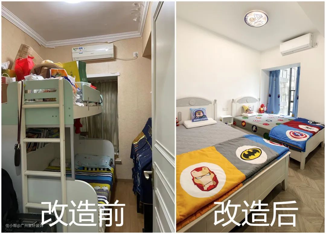 儿童房外移使其方正,两张1.2米的儿童床并排放置给到小孩子独自睡眠的空间,还留出了空间定制收纳柜。