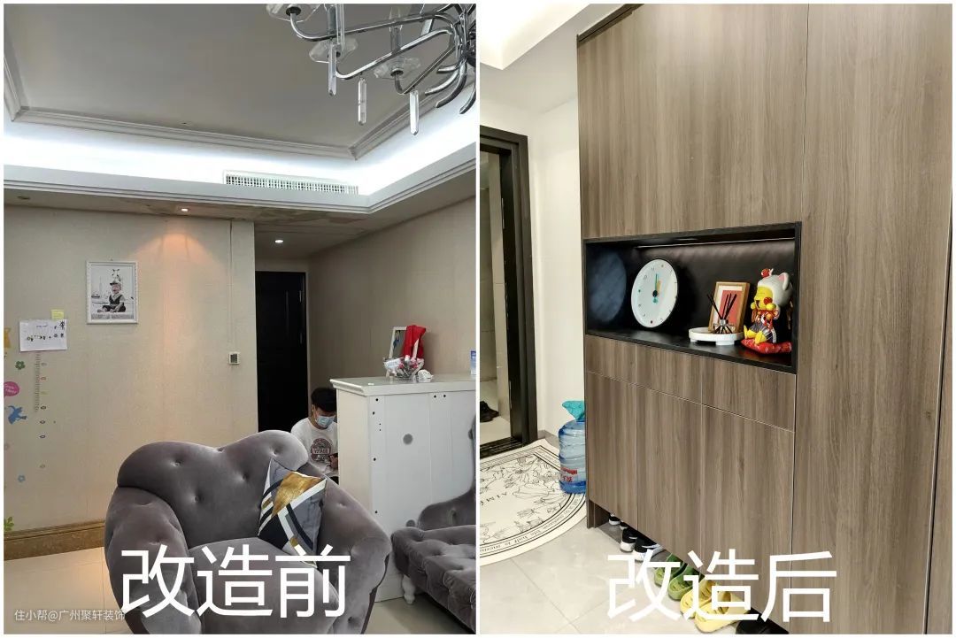 改造亮点: ①入户增加与电视柜一体玄关柜,增加收纳空间 ②拆除原厨房一侧非承重墙,使客餐厅空间更开阔流畅 ③打通餐厅外的杂物阳台并到厨房内,整体橱柜长达4.5m ④儿童房不规则墙体外移至方正,使其并排放下两张单人床,还有收纳设计 ⑤位移主卧门洞,避开过道直面门、床的问题,也省去再做屏风隔断的可能 ⑥极简风格设计,减少空间负担,提高颜值与实用性能