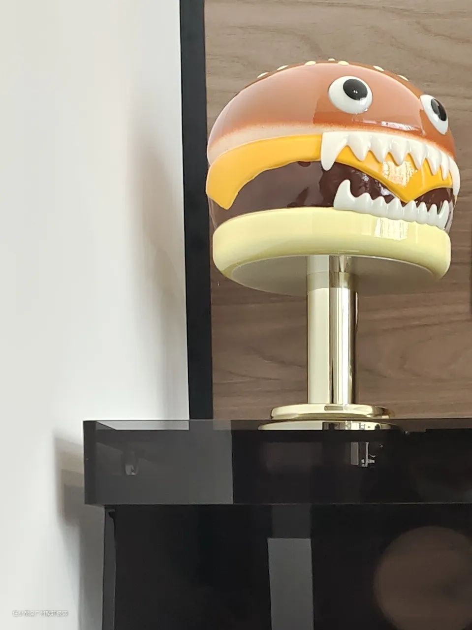 床头安装了木饰面背景板,内藏灯带满足不同的照明需求。床头柜添加了造型搞怪趣味的Undercover汉堡灯装点空间,氛围感十足。
