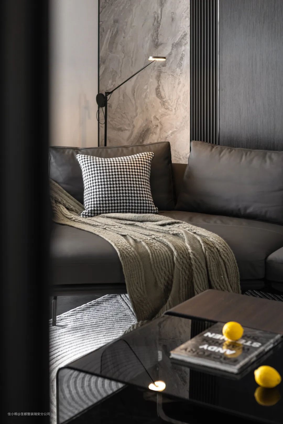 通过和沙发背景呼应的灰色岩板,来连接入户门中间的空间,使空间更加连贯,弱化比较小的电视背景。