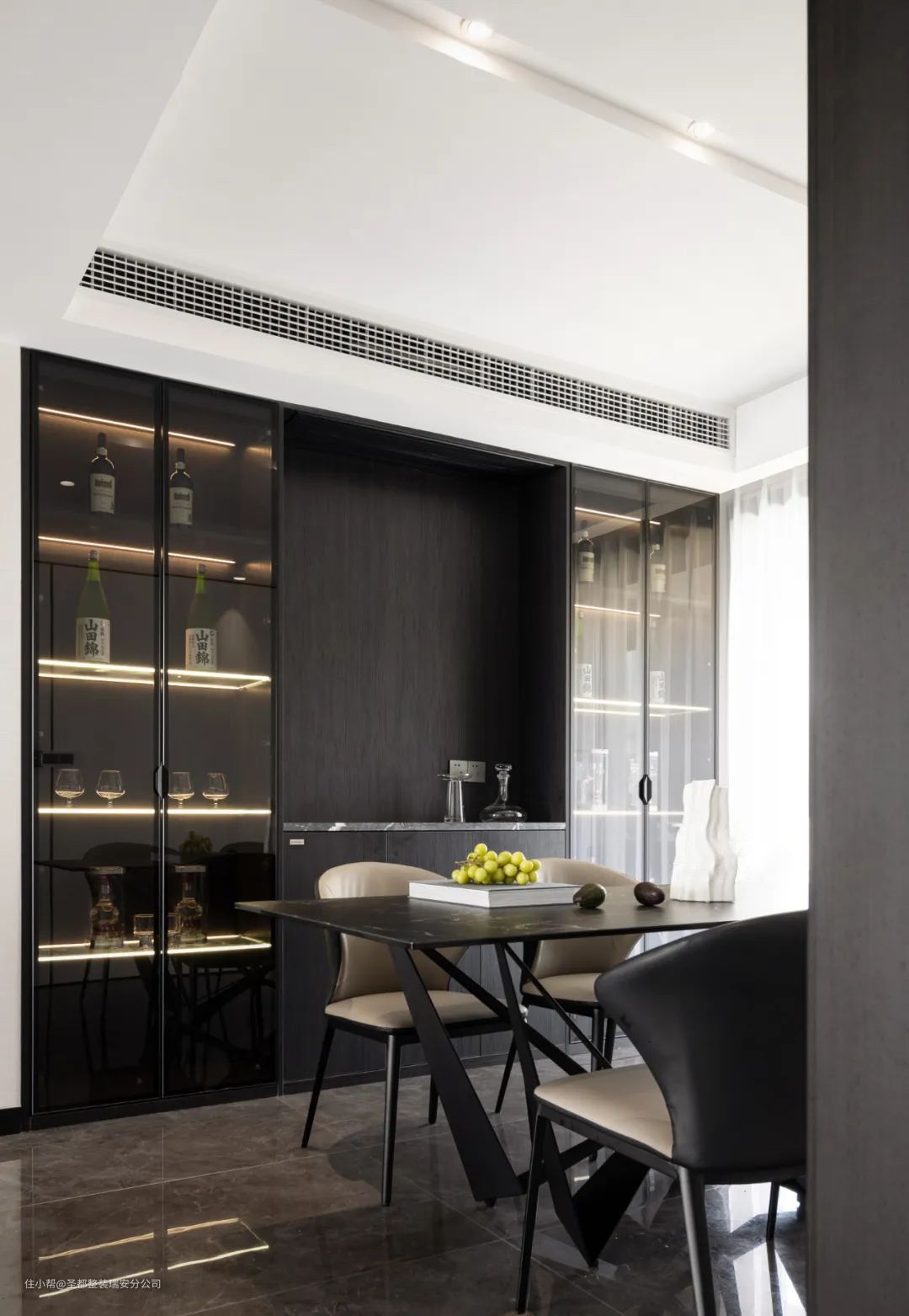 餐边展示柜内置灯带,为酒藏营造氛围感。