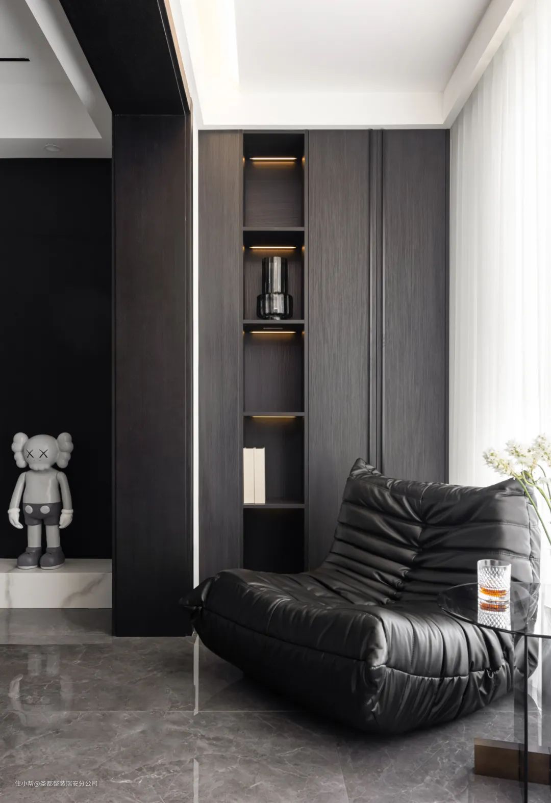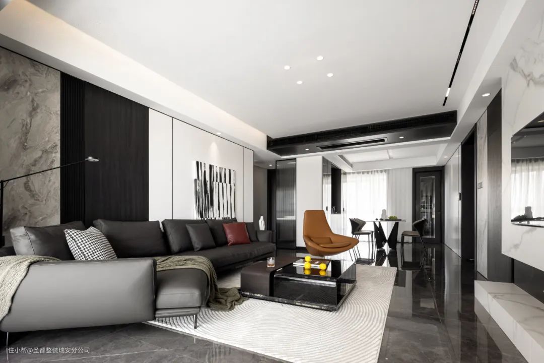 温润的白色护墙和和顶面白色无主灯吊顶,配上简约大气的真皮黑色沙发,两相对立的颜色巧妙融合,让空间在保留深色质感的同时,还能明亮通透。