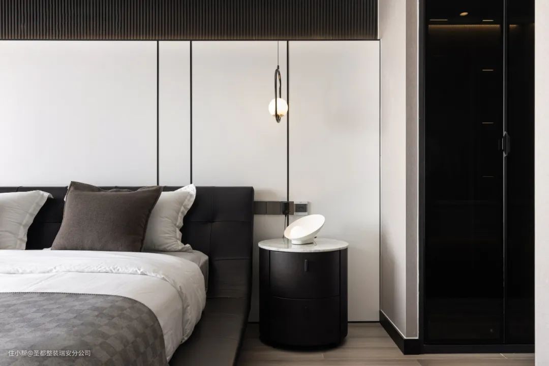 灯光的布局遵从极简、柔和的原则,保持卧室的温馨柔和。