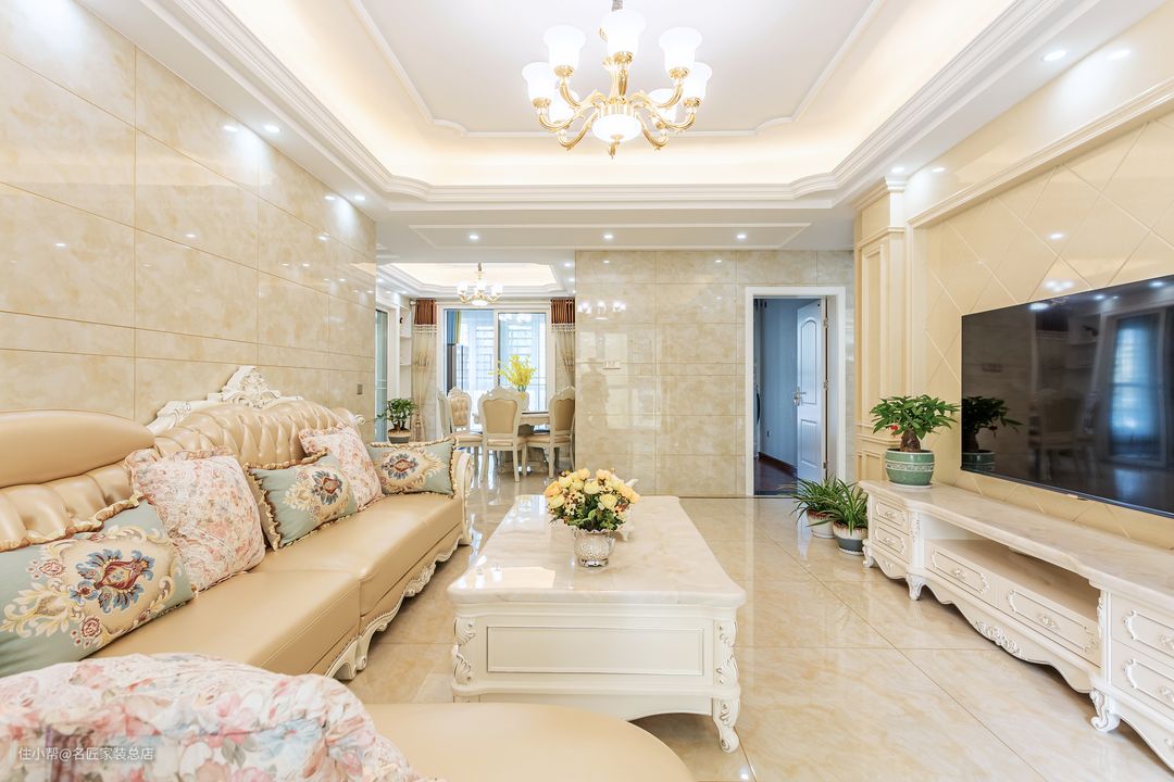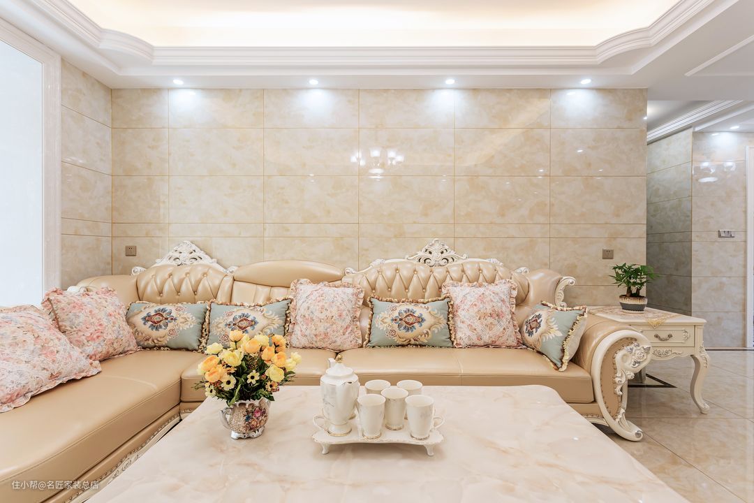 客厅空间 弥漫着米黄色的温馨氛围 同色系雕花欧式沙发 以优雅的姿势拥抱主人 精致的英式茶具 芬芳四溢的鲜花 开启悠闲的下午茶时光