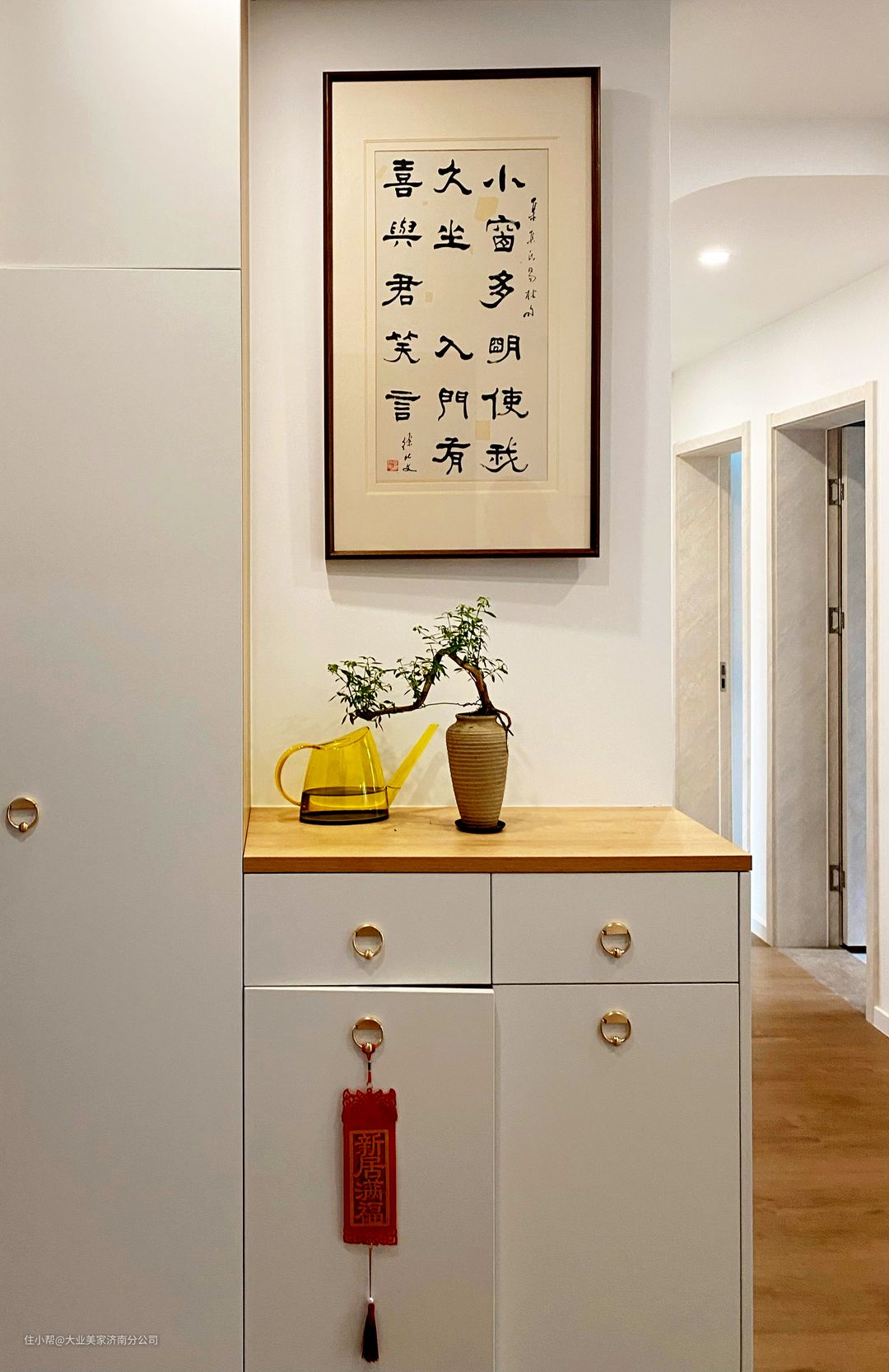 进门玄关处,放置了一个简单的小柜子,上方的小盆景和书法装饰,增添了几分艺术气息。