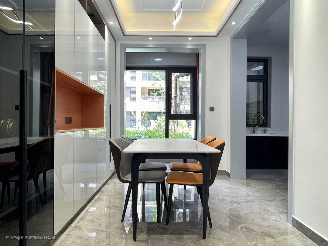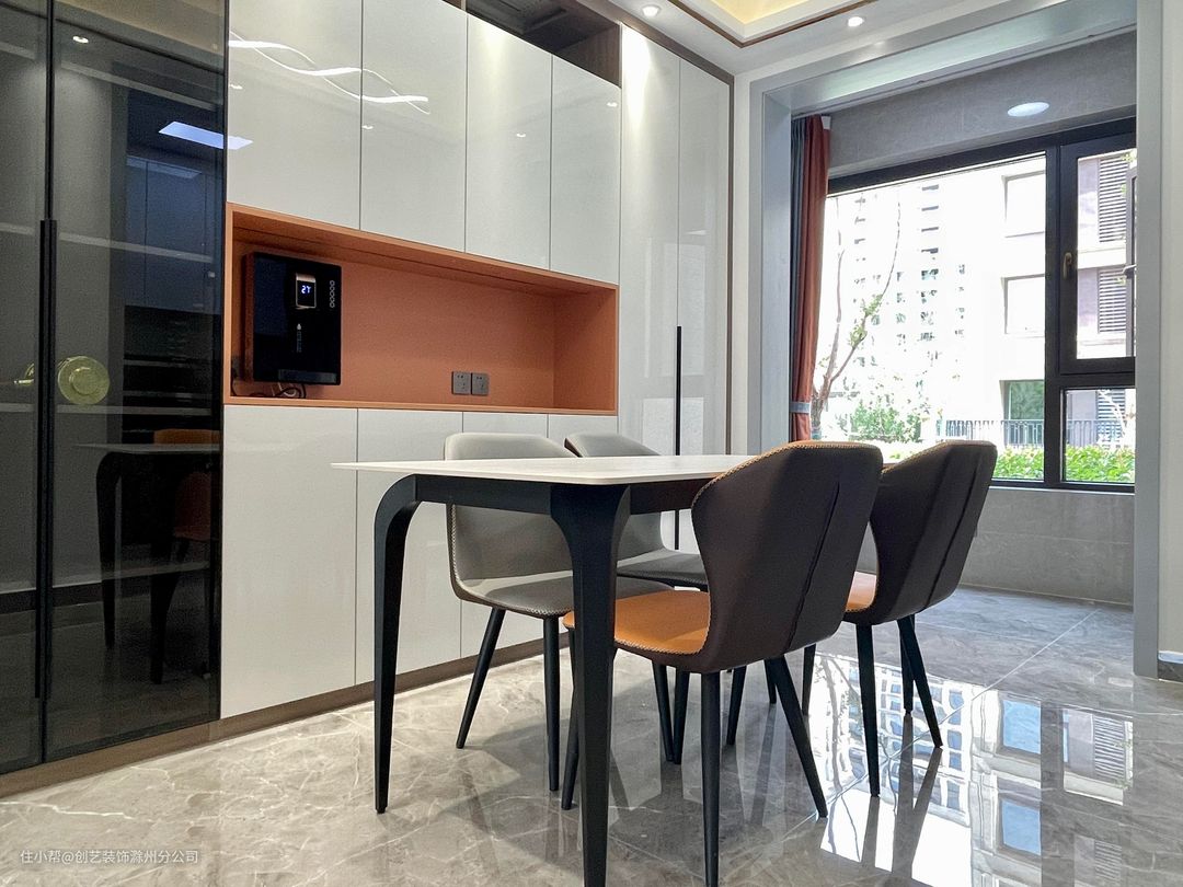 餐厅放置四人座大理石桌面餐桌,座椅的橙色亮色与餐边柜中部悬空橙色呼应,搭配大面积的白色柜门,干净透亮,侧边黑玻璃柜面设计可以展示一些有设计感、亮眼的餐具。