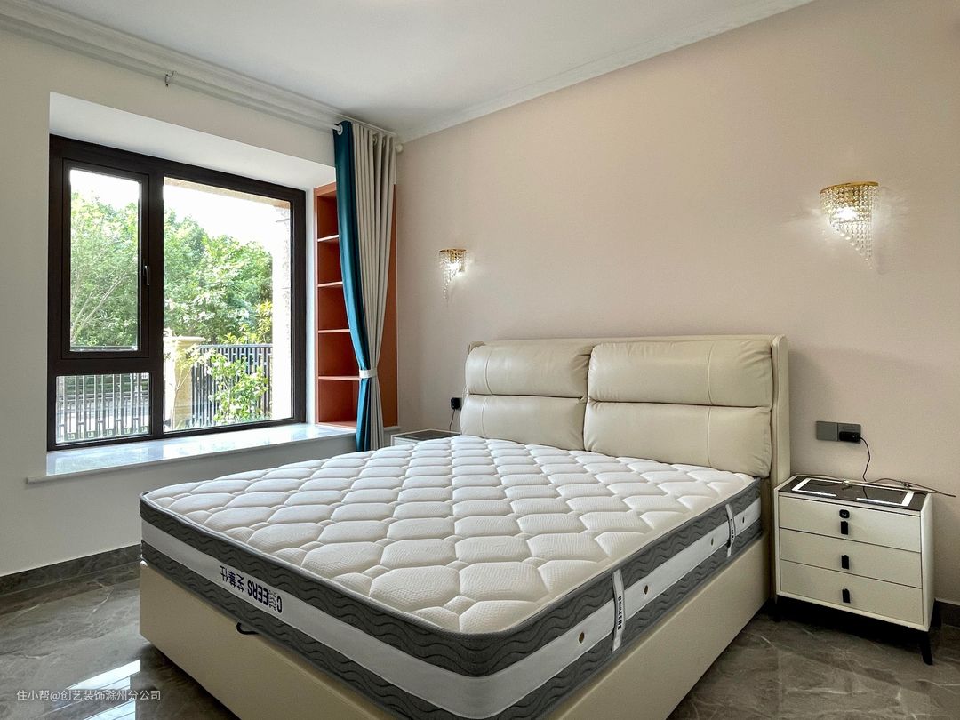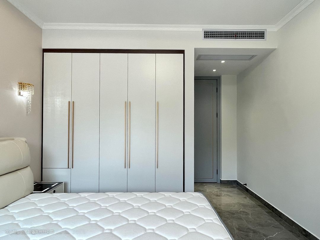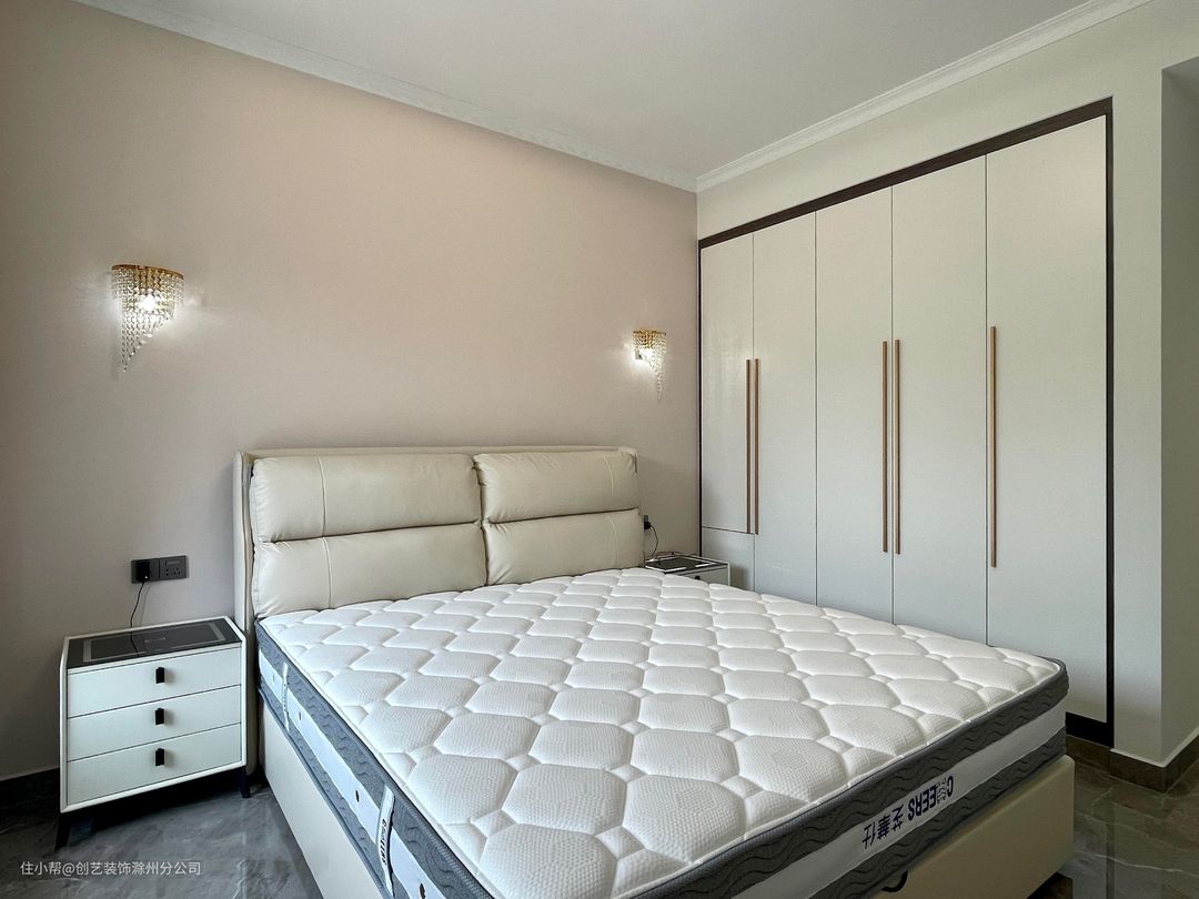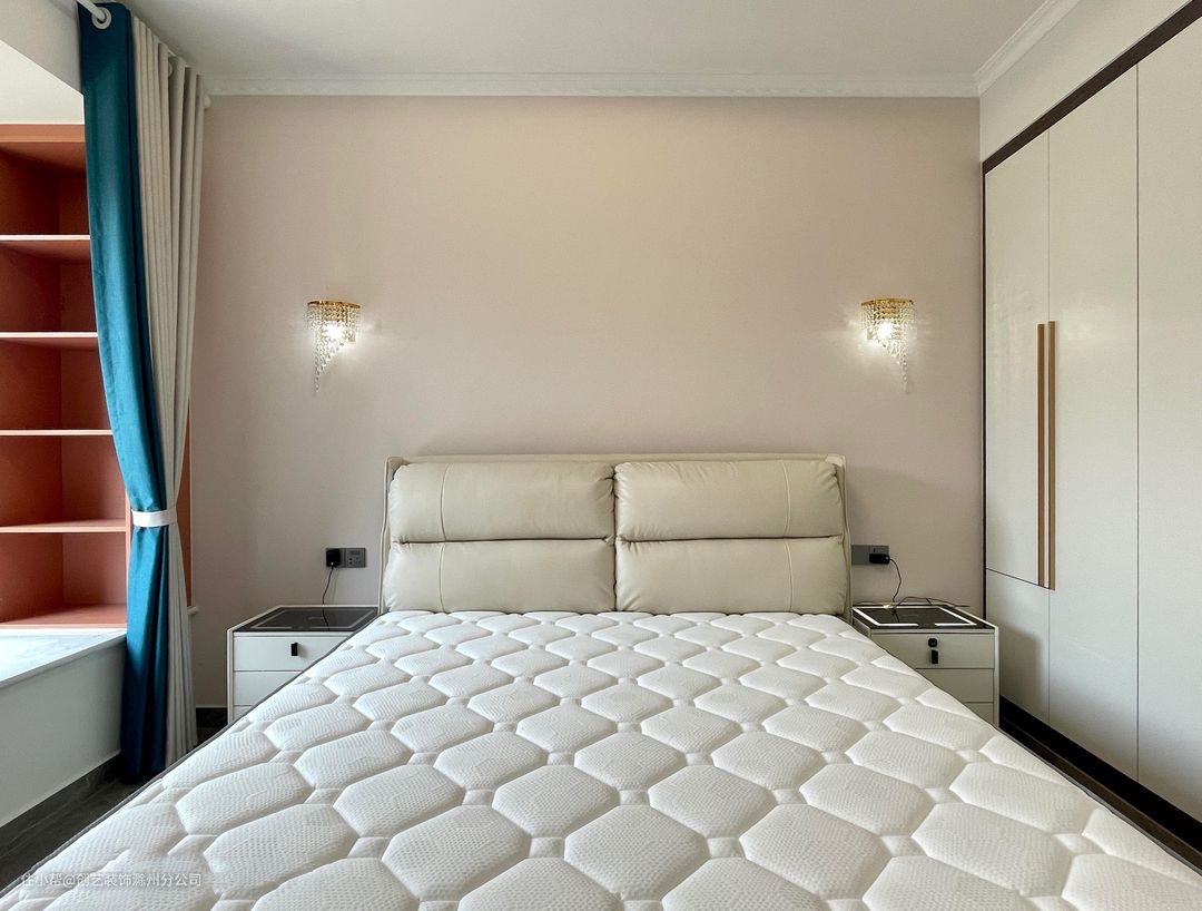 主卧飘窗一侧设计隔板柜,可以放置书籍、乐高,在飘窗放置靠枕,形成一个休闲放松的小空间;浅粉色墙漆搭配金属带加串珠的设计,为整个空间增加了设计感,床头柜亦可作为床头灯使用,白色衣柜门加上金属把手,整个设计简约大气。
