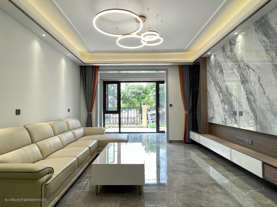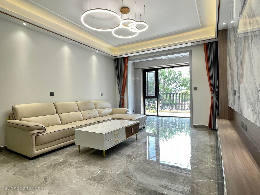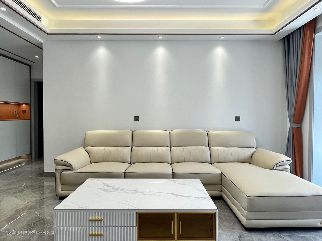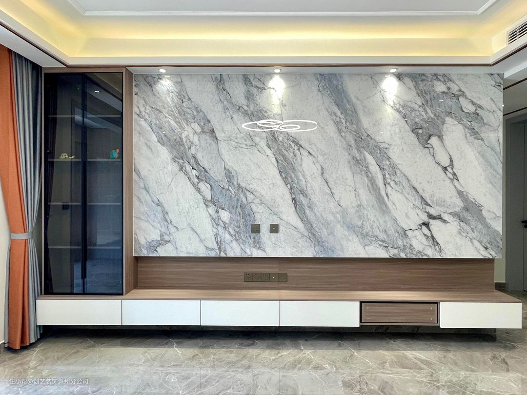 客厅整体采用白色墙漆,搭配乳白色皮质沙发,大理石桌面+茶色玻璃柜门的茶几,更显精致,其上茶色玻璃与电视背景墙的悬柜、玻璃展示柜相呼应,搭配岩板加木质纹的铺设,电视背景墙提升了整个空间的档次。