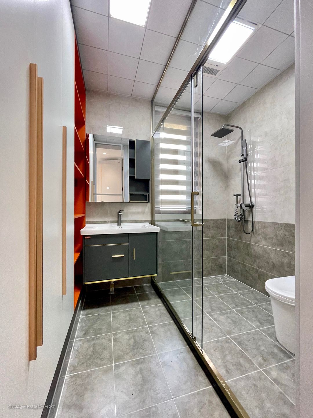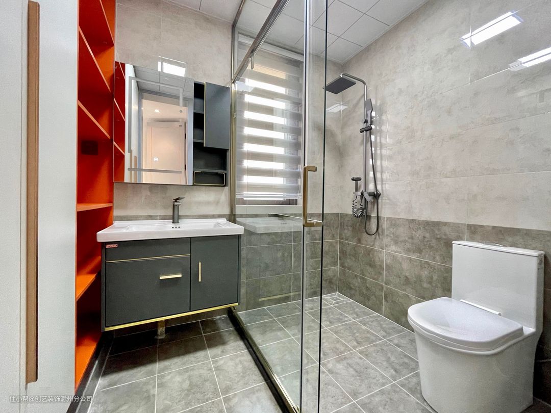 主卧卫生间干湿分离,内部淋浴,外部洗手台加衣柜,将衣帽间与洗手台结合,是设计师想法的一大亮点体现。