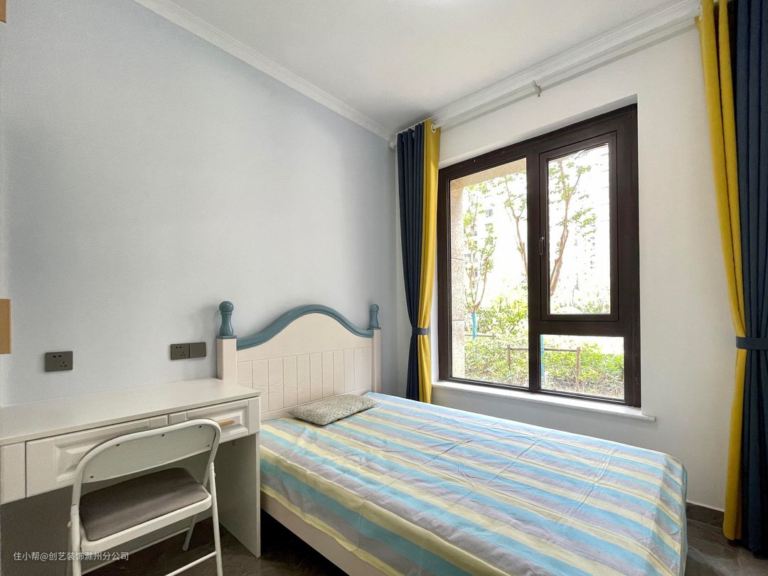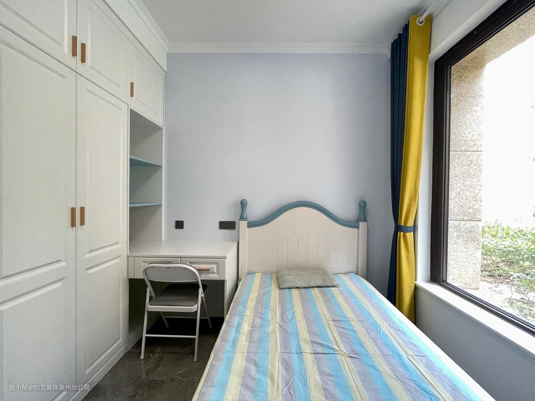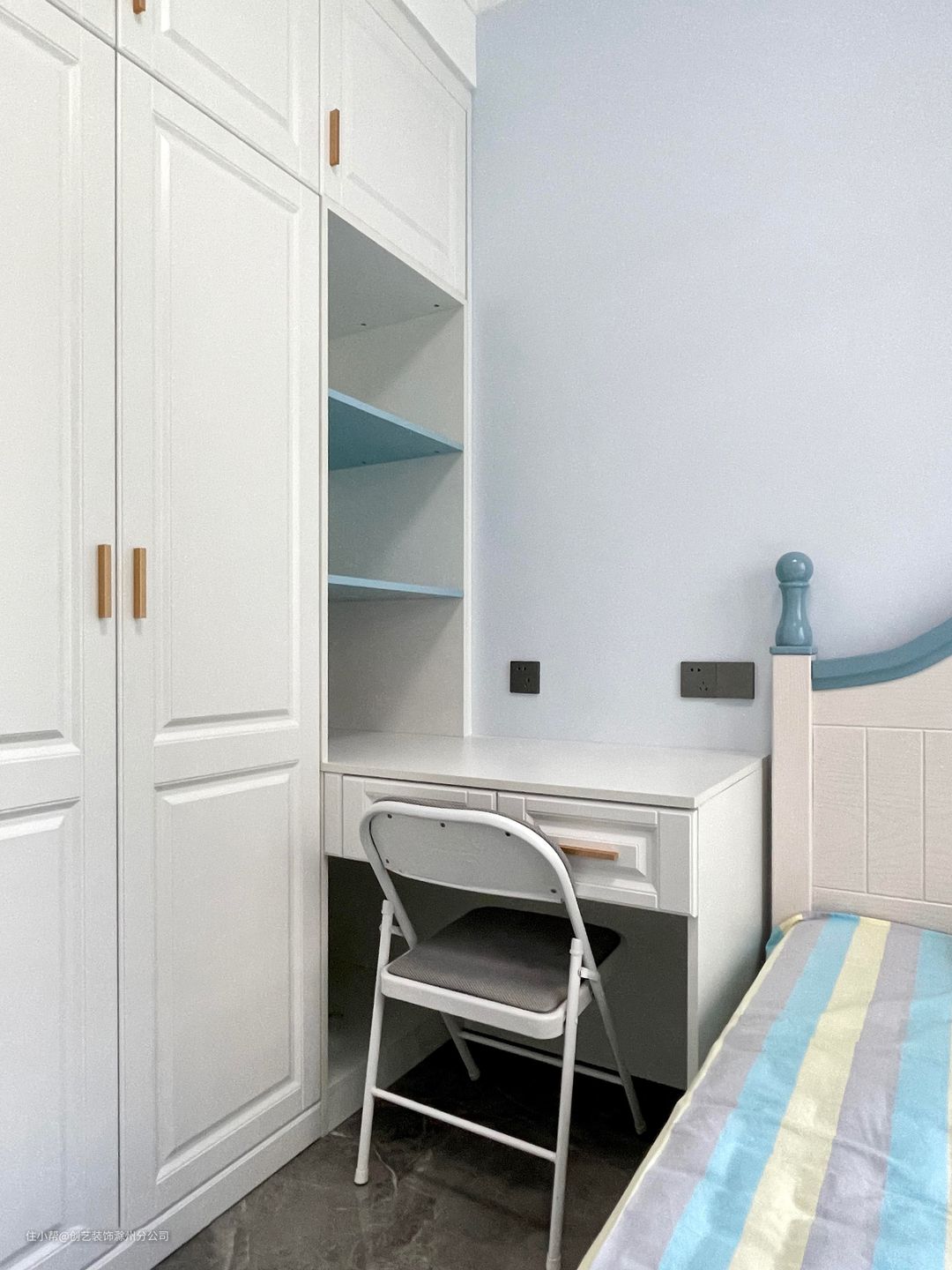 次卧是业主孩子的房间,沉静的蓝色为整个空间增添了色彩;衣柜加书桌的设计,可能是大多数家庭的首选,既可以为孩子提供出窝空间,也提供了学习空间,增加空间利用率。