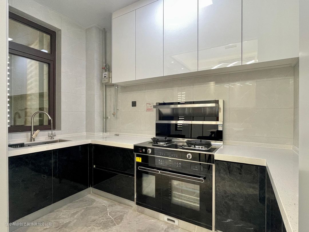 厨房与餐厅是开放式设计,黑色岩面柜门搭配白色台面的橱柜,洗-切-烹动线流畅,集成灶让整个空间不会被油烟所覆盖,悬空橱柜,增加储物空间,物品储存更加合理,不易受潮。