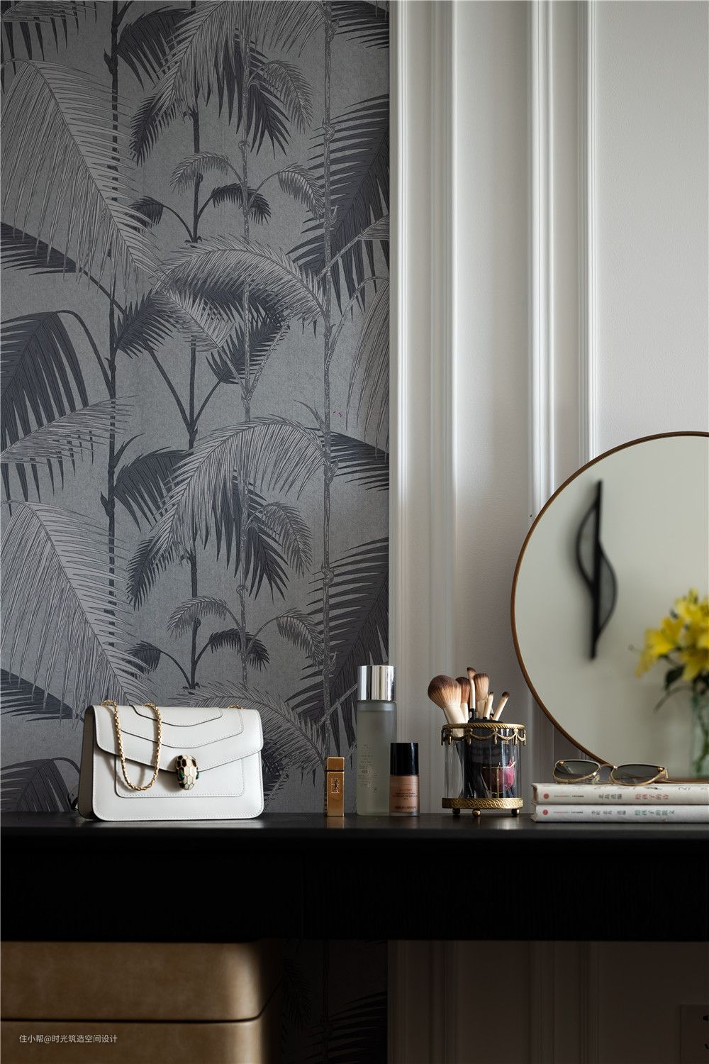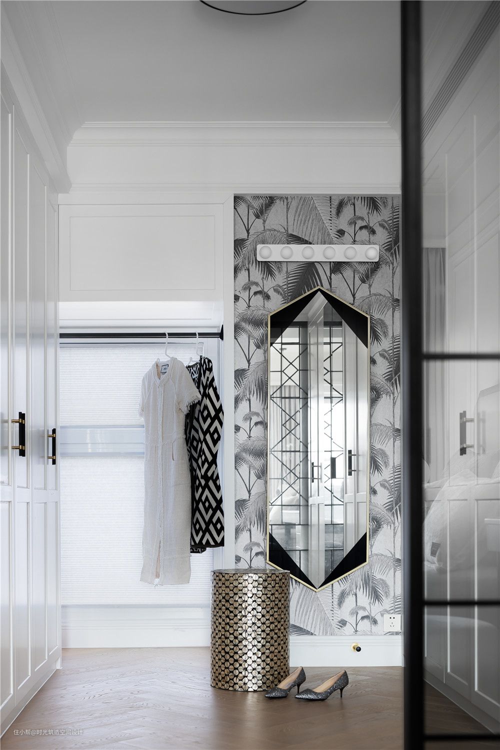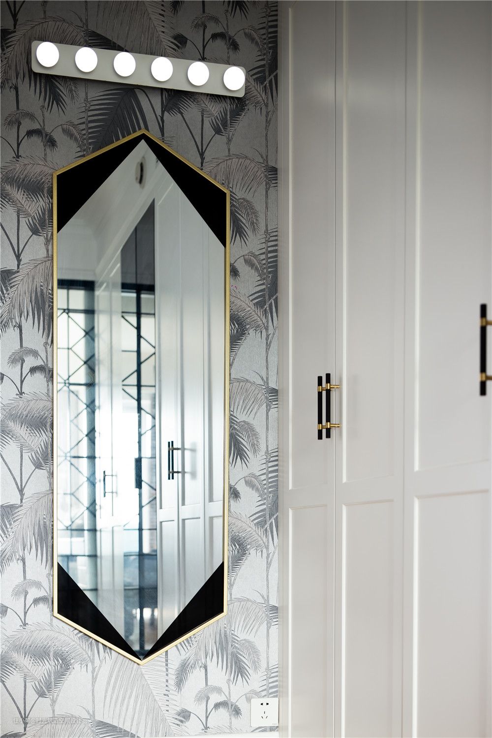 衣帽间镜子延续热带风格元素,玻璃包柜采用局部灯光,让主卧空间从视觉上更加开阔。