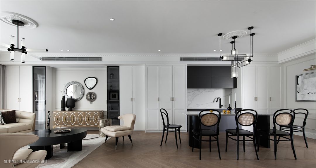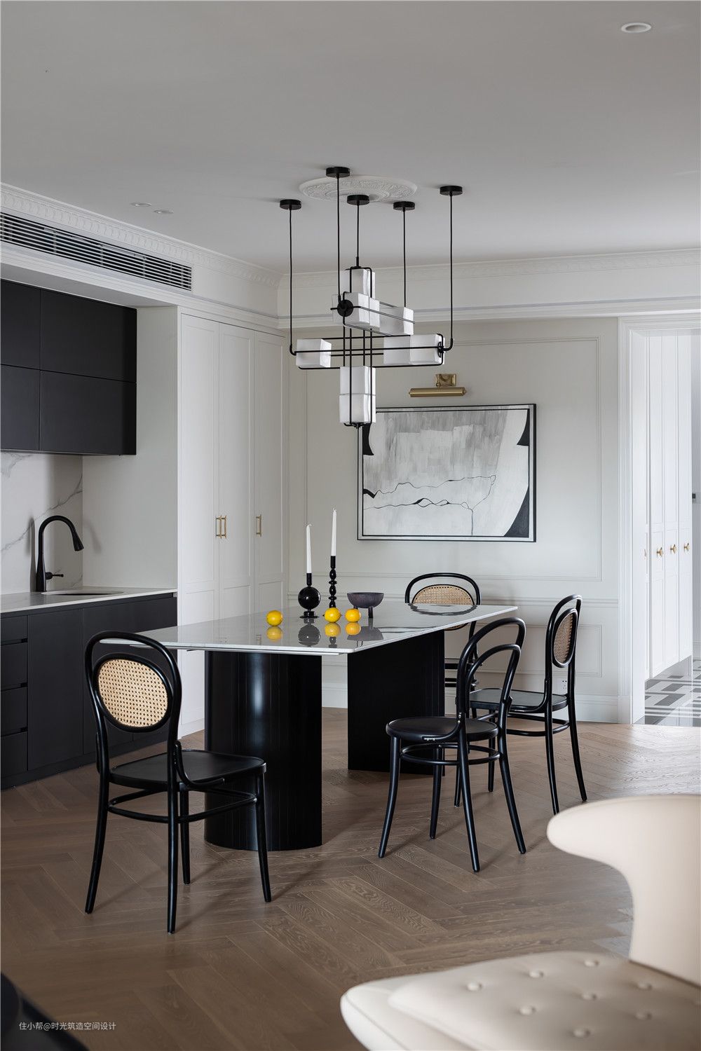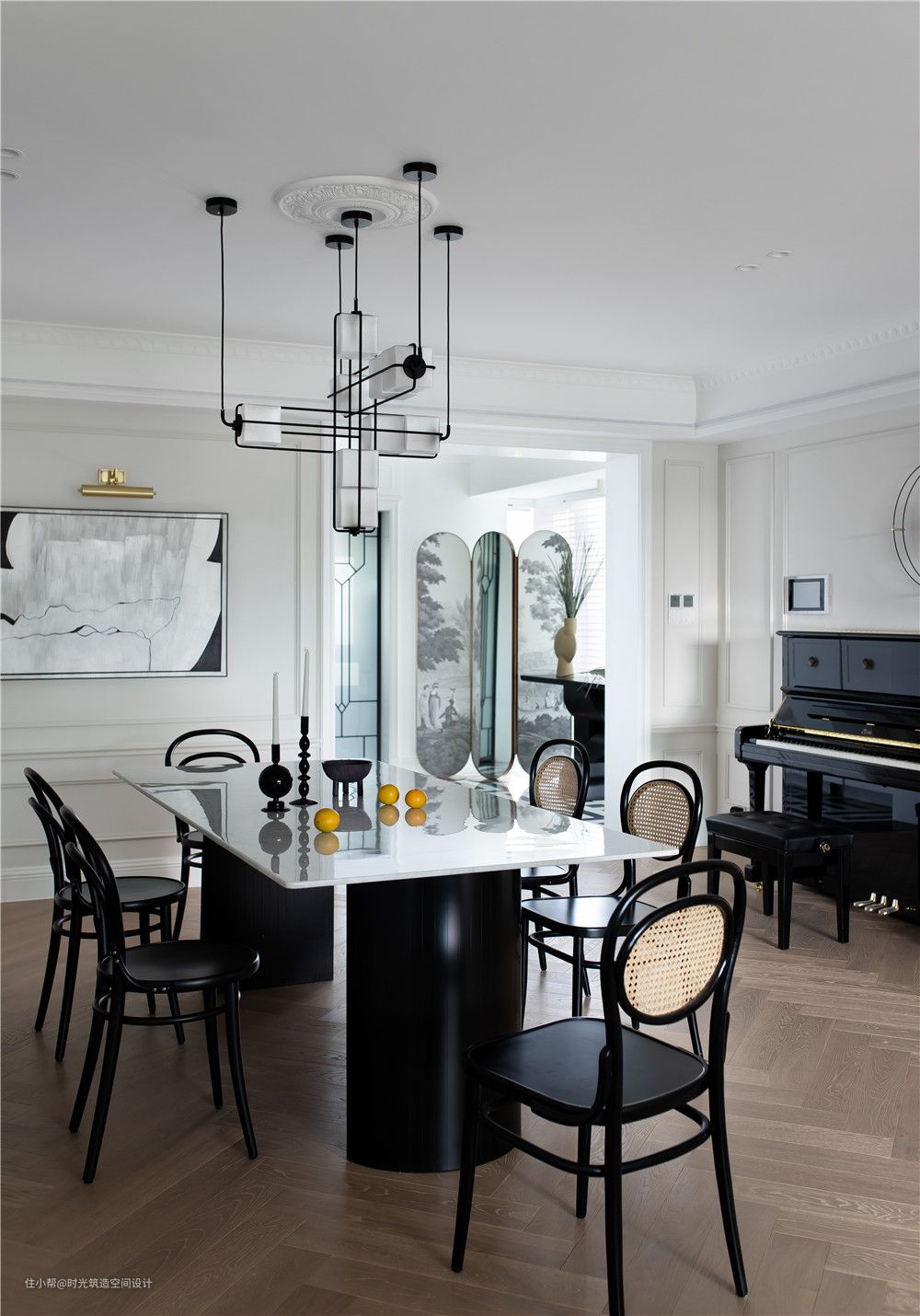 餐厅的座椅选用两种不同的饰面材质,捷克TON复古藤面单椅,呈现休闲感,餐桌尺寸为1800*800,这个视角也将玄关的美丽尽收眼底。 黑色钢琴 艺术挂钟 复古的柜门 错落有致的几何吊灯与远处的罗马柱彼此呼应和融合,一段温馨惬意的晚餐时光慢慢而来。