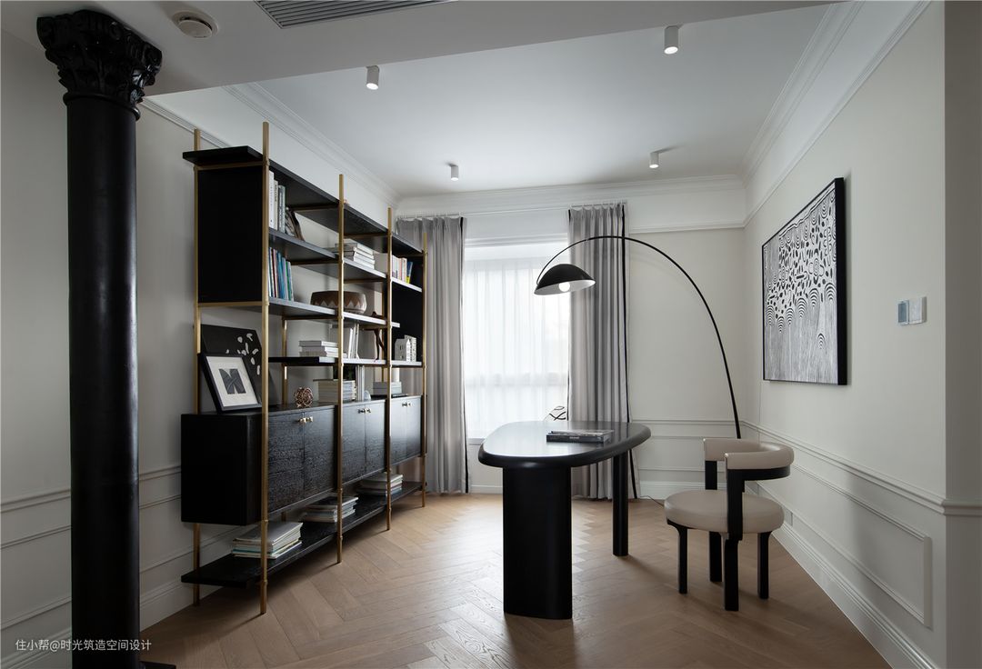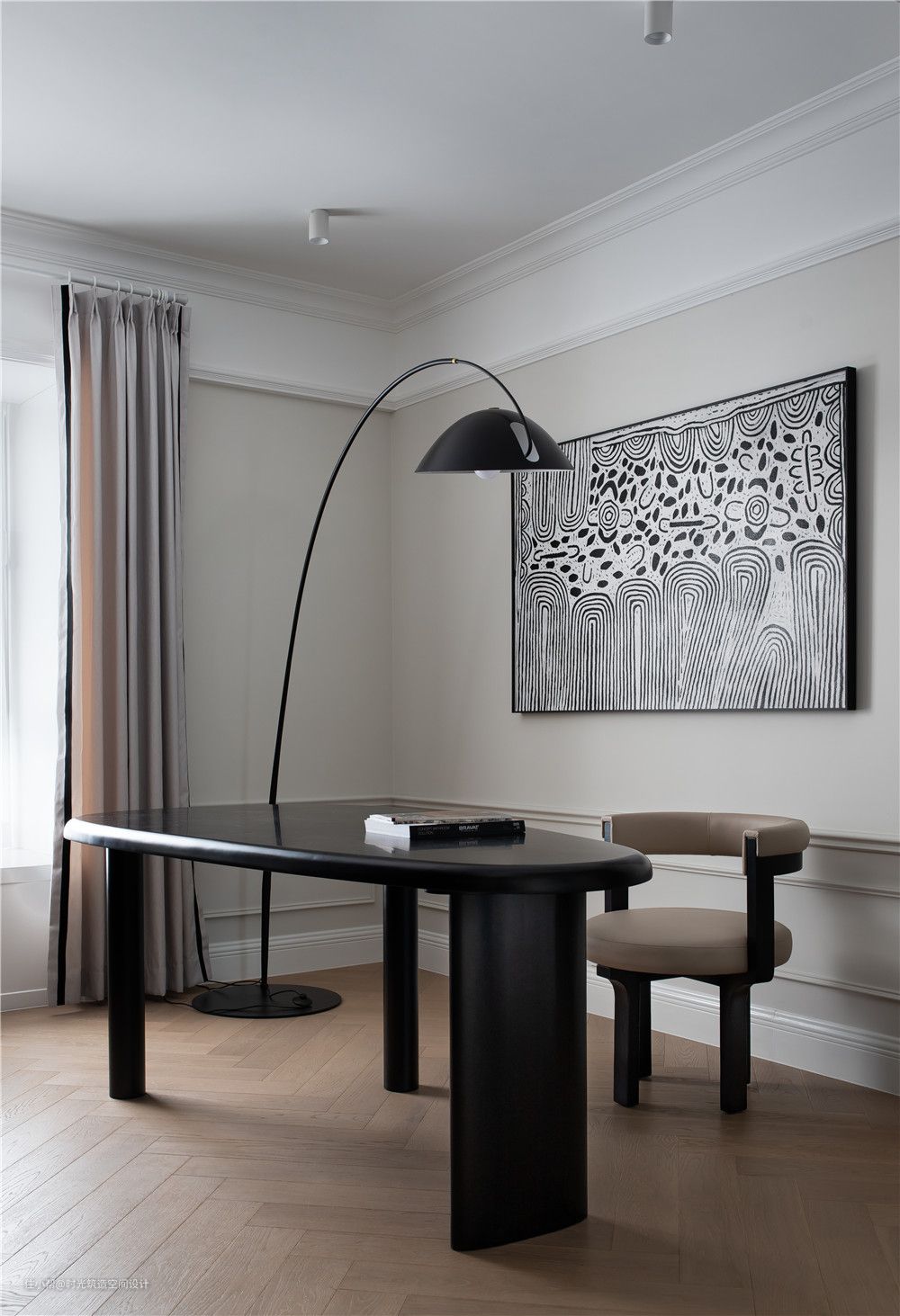 考虑客厅已有大量收纳,书房设计以轻巧和艺术为中心,因此定制成品书架,艺术摆件和书籍陈列在一起,抽象的手绘黑白挂画与异形的书桌以及钓鱼台灯都为书房增加了趣味性。