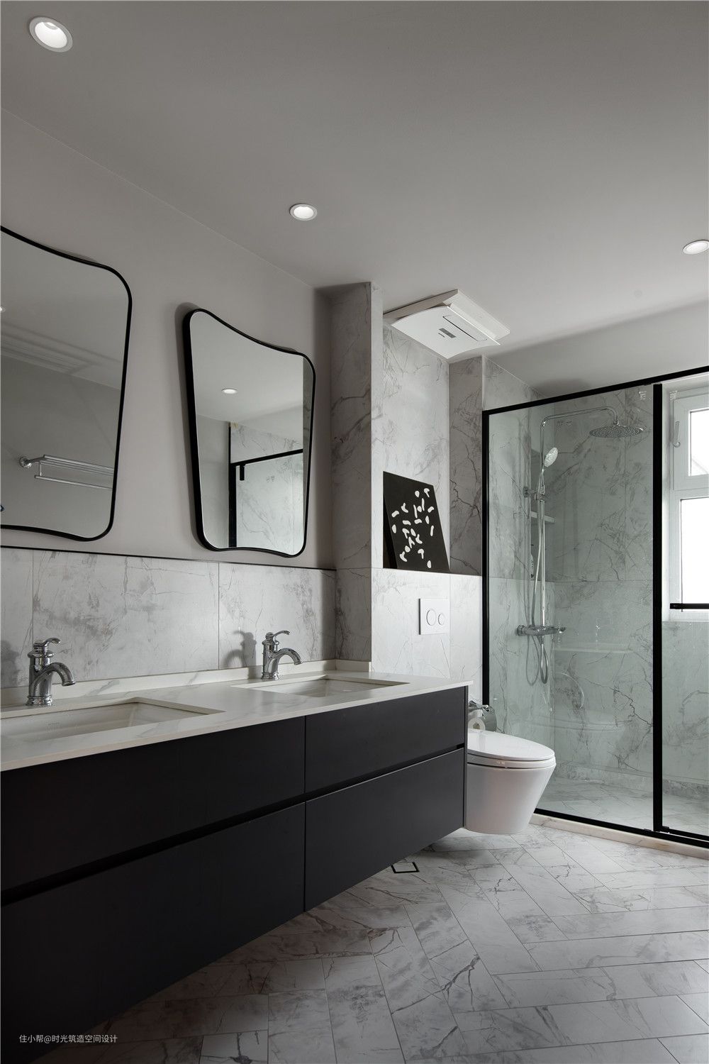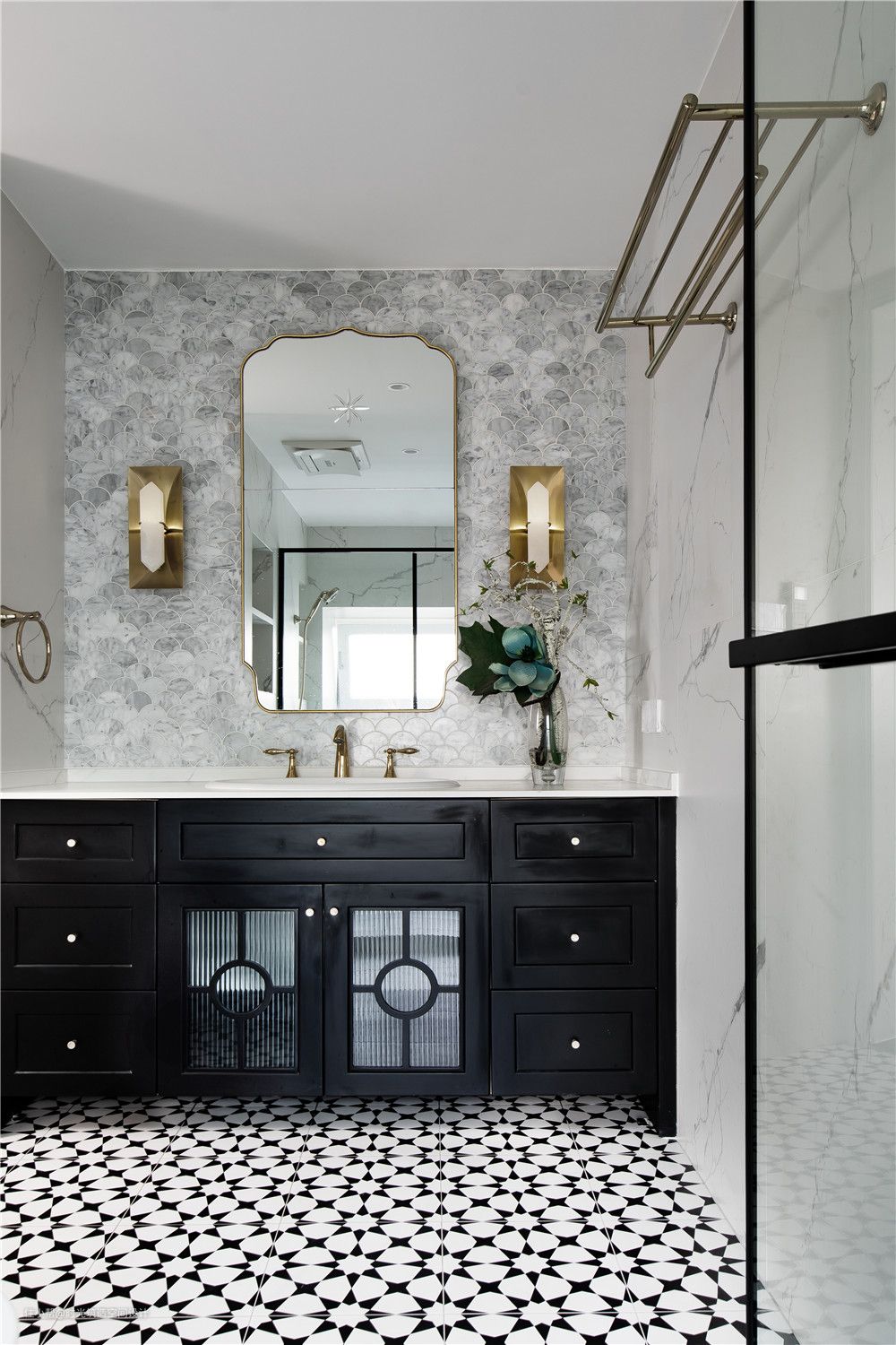主卫通过鳞片马赛克的点缀去结合黑白小花砖,搭配复古刻花镜和金色的矿石壁灯体现其整体高级感,而在公卫的设计上将同样的材质用不同的铺贴方法去呈现。