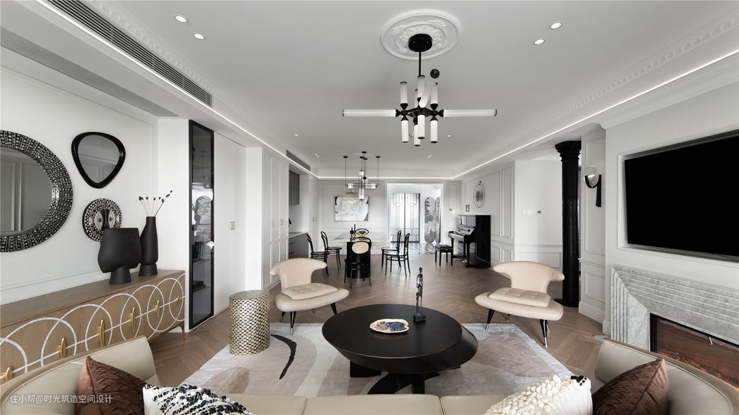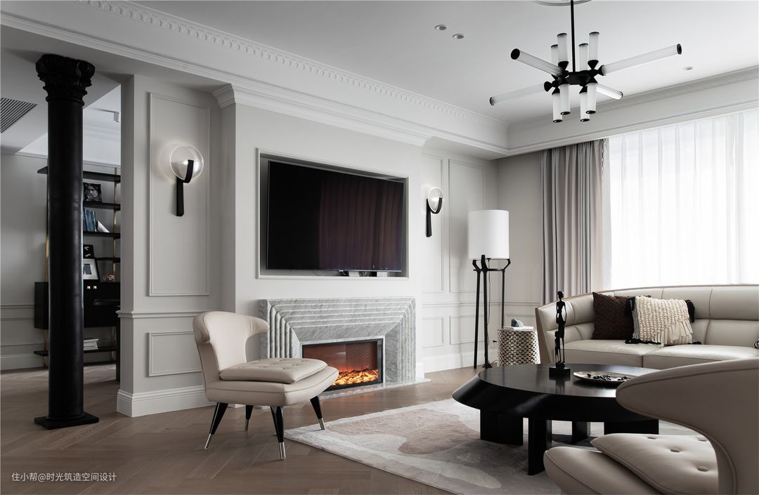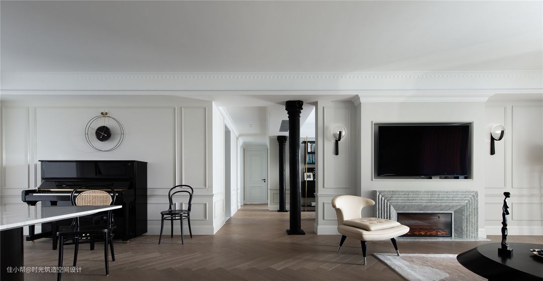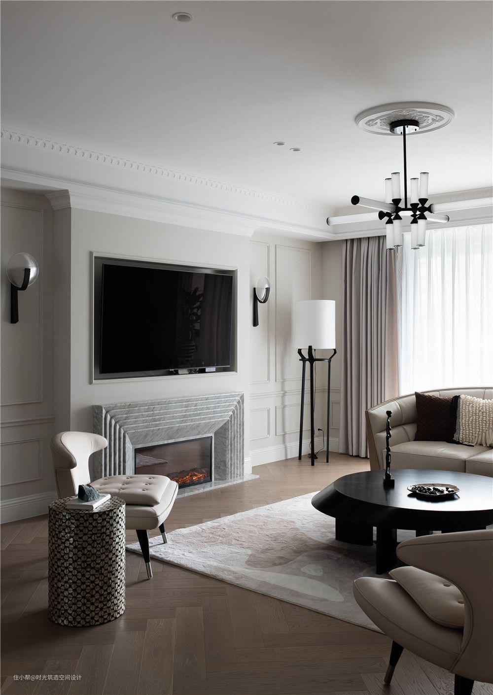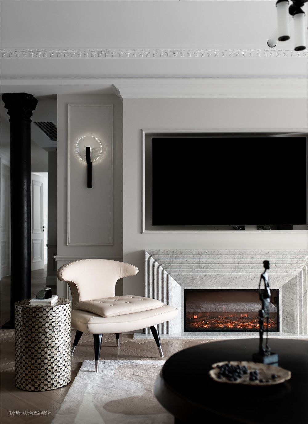 墙面背景采用了干净明朗的白色线条,65寸电视观感舒适,细花白天然大理石做成的壁炉层层叠叠,简约与繁复都得到极致体现。