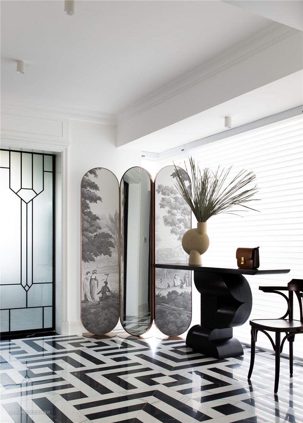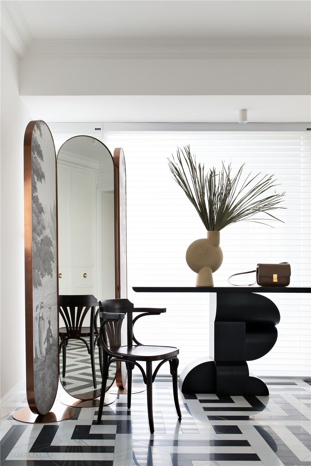 定制款三折屏风成为玄关亮点,它不仅承载风格衔接还兼具一定“功能性”。可作为更衣镜,利用来自春在东方的玫瑰金色边框与桌面形态粗狂的花瓶形成完美的视觉与色彩的呼应。 不对称的艺术条案与黑白拼花的地板相得益彰,一把来自BONACH CASA 博纳奇古董的单椅永远安静的等待你归来。