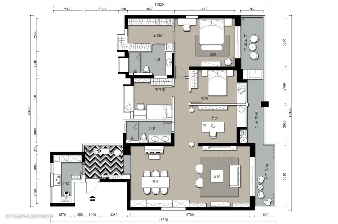 “调整后的平面方案” ① 在餐厅旁边西餐功能柜以及水盆台面解决厨房较小和离餐厅太远的问题。 ② 借用儿童房卫生间空间做主卫,原主卫改衣帽间,解决原本衣帽间局促和通风性较差的问题。 ③ 本案为三口之家,更多互动空间及收纳是主要需求,因此将书房做成开放式,更加大气。