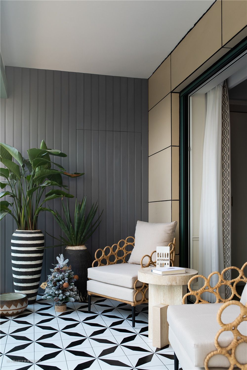 阳台通过黑白的地面以及深灰的墙面防腐木,搭配舒适且造型特别的沙发椅,孤品的花器配上一些热带的植物,让阳台也呈现出一种法式度假风的慵懒惬意。