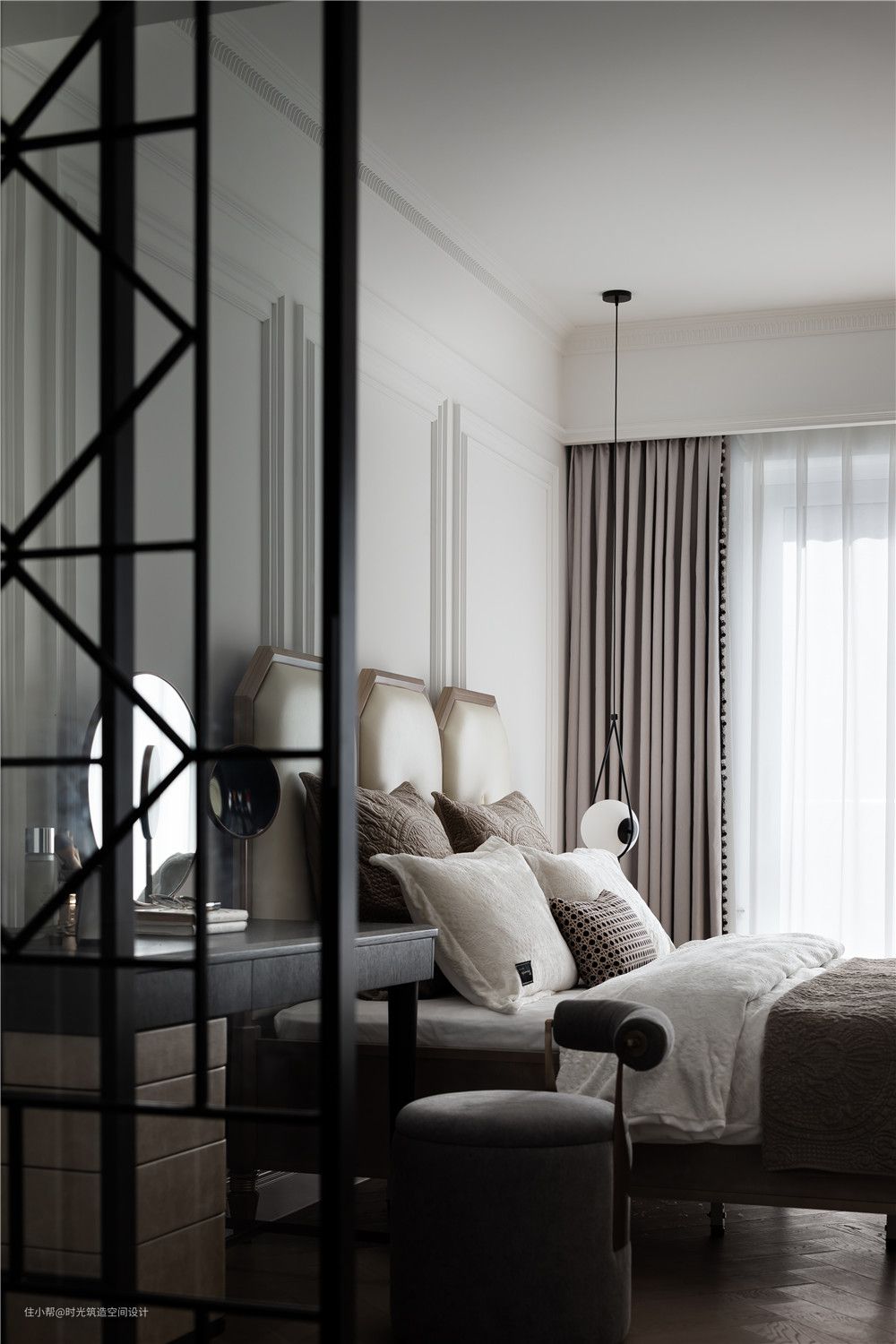 透过衣帽间的格栅门,整个卧室宁静的感觉扑面而来。