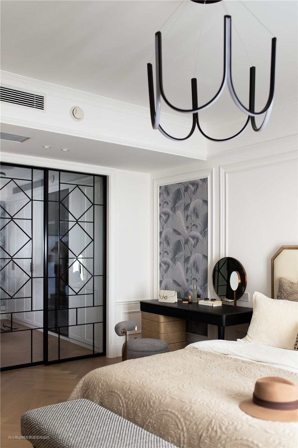 双拼色的梳妆台 层叠的装饰镜 现代造型感十足的椅子 简约的黑白吊灯 ,这一切在干净的白色背景的映衬下熠熠生辉。