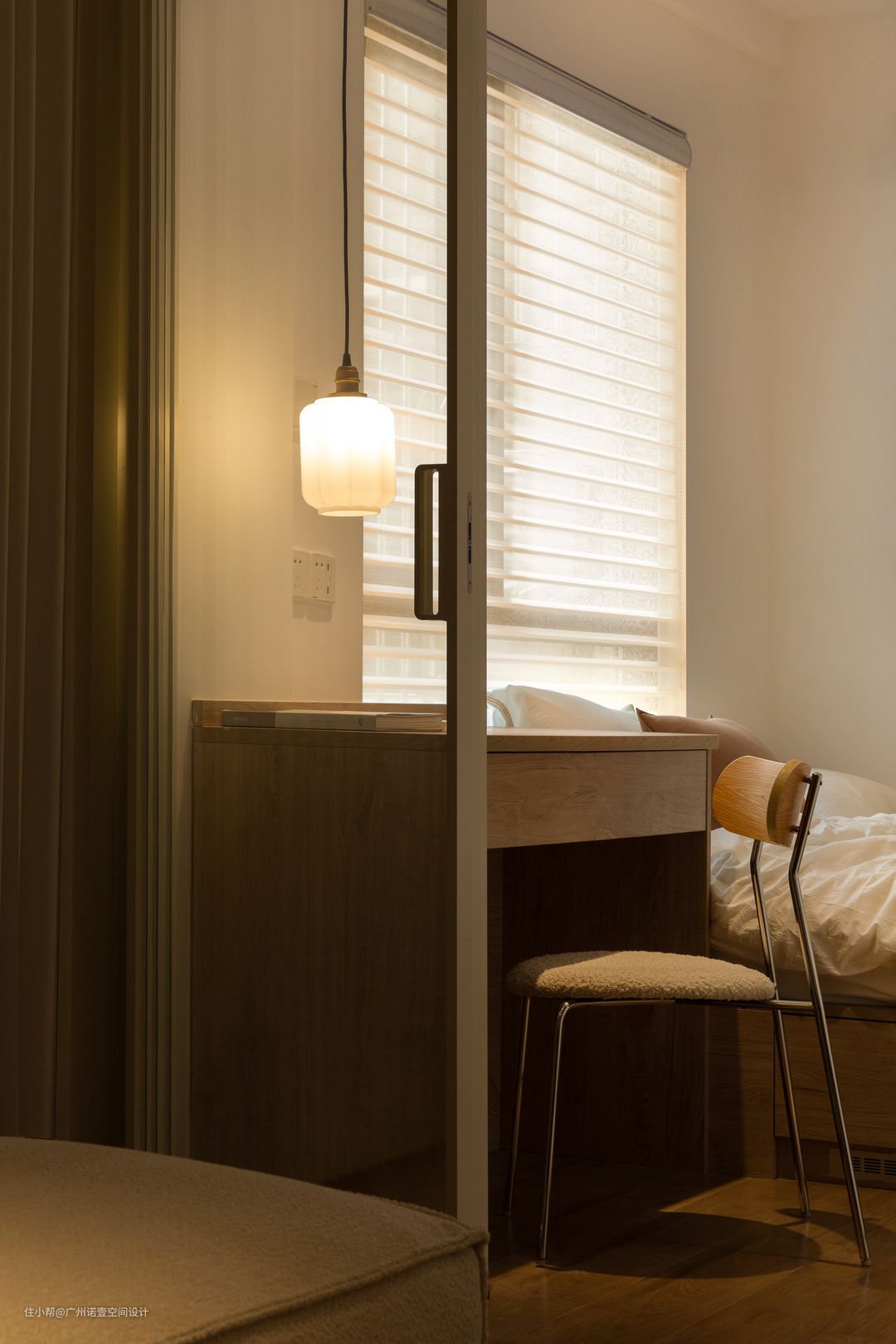 床边的书桌亦可作为床头桌使用; 窗户装香格里拉窗帘,遮阳不遮景,好看又实用。 #香格里拉窗帘#窗帘#化妆桌