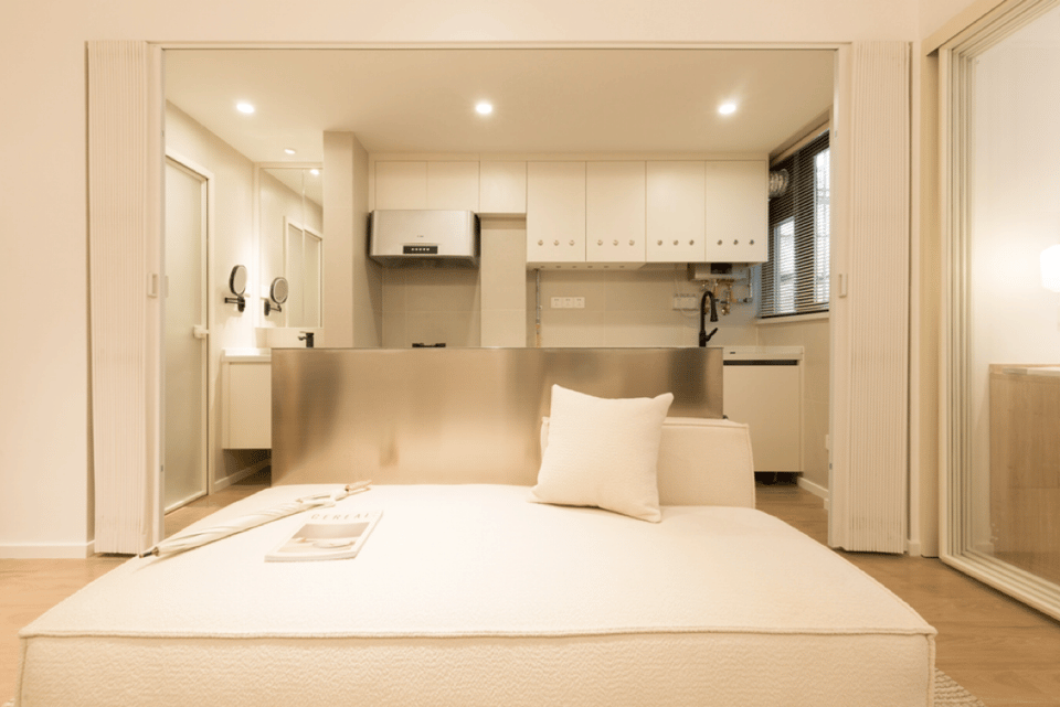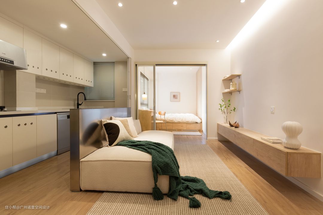 厨房与客厅的隔墙拆除后,中间利用窄吧台隔开厨房与客厅空间,也可作为沙发靠背使用。 利用卧室玻璃推拉门的通透性营造假象,使得整体空间看起来更大,视野更为广阔; #吧台#客厅#沙发#玻璃门