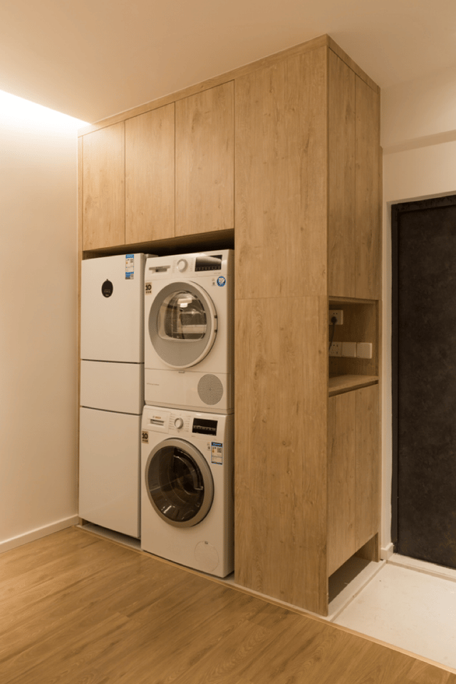 侧面加装柜体,可放置洗衣机+烘干机及冰箱; 减少冰箱的占地面积,且完美解决无阳台的烦恼。 #鞋柜#收纳柜