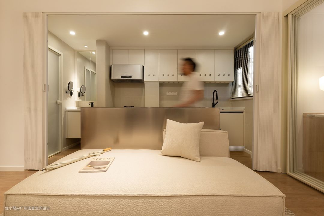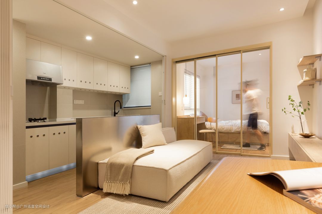厨房与客厅的隔墙拆除后,中间利用窄吧台隔开厨房与客厅空间,也可作为沙发靠背使用。 利用卧室玻璃推拉门的通透性营造假象,使得整体空间看起来更大,视野更为广阔; #吧台#客厅#沙发#玻璃门