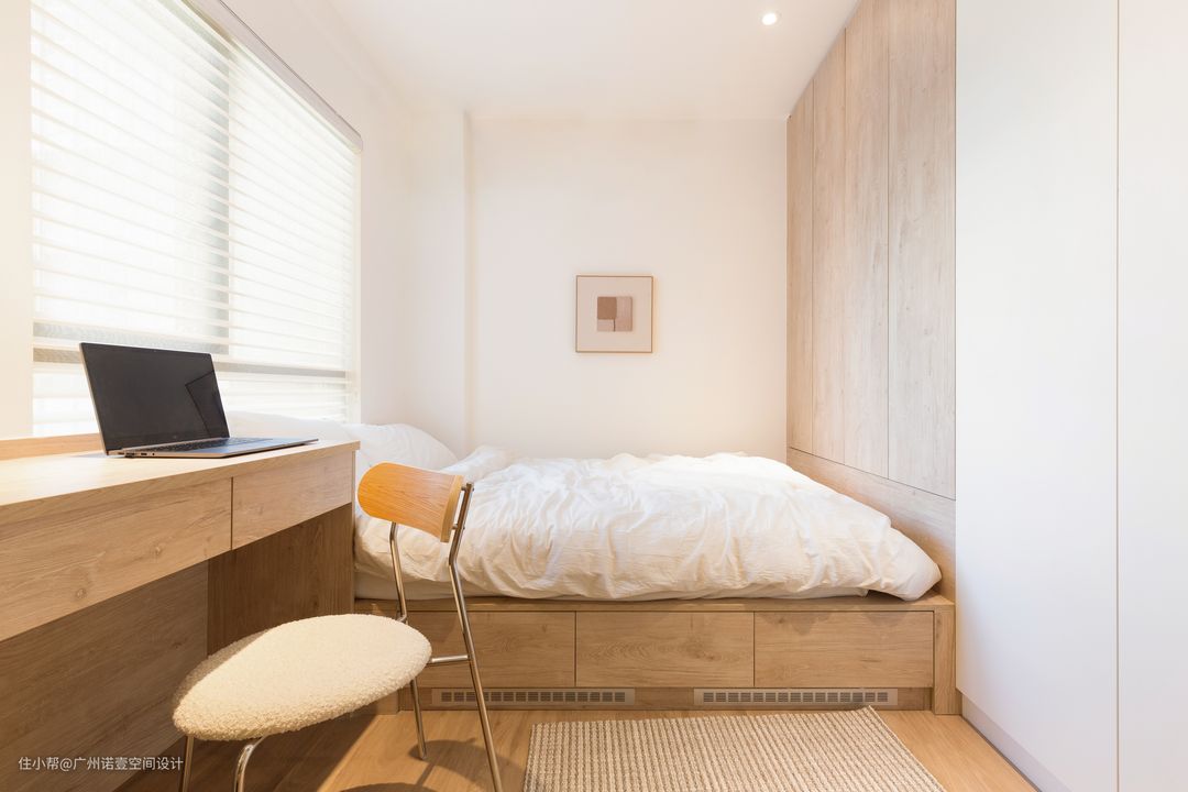 卧室改日式榻榻米床,床底可收纳床褥; 在床尾加装到顶衣柜,满足日常需求; #卧室#榻榻米#衣柜