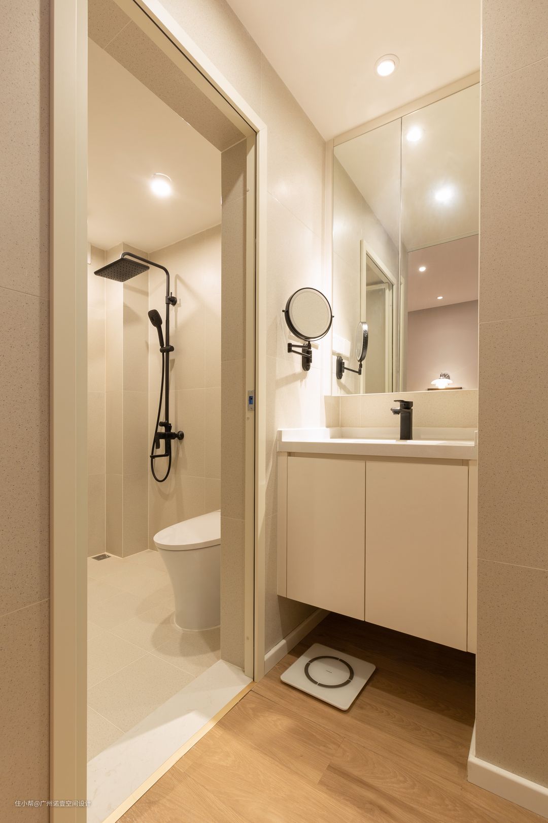 按照业主需求,将洗漱台和镜柜布置在卫生间门外,底下可放置扫地机器人; 卫生间内整体使用白色瓷砖,显得空间更大; 最后再利用黑色花洒龙头与整体色调做搭配。 #卫生间#花洒#龙头